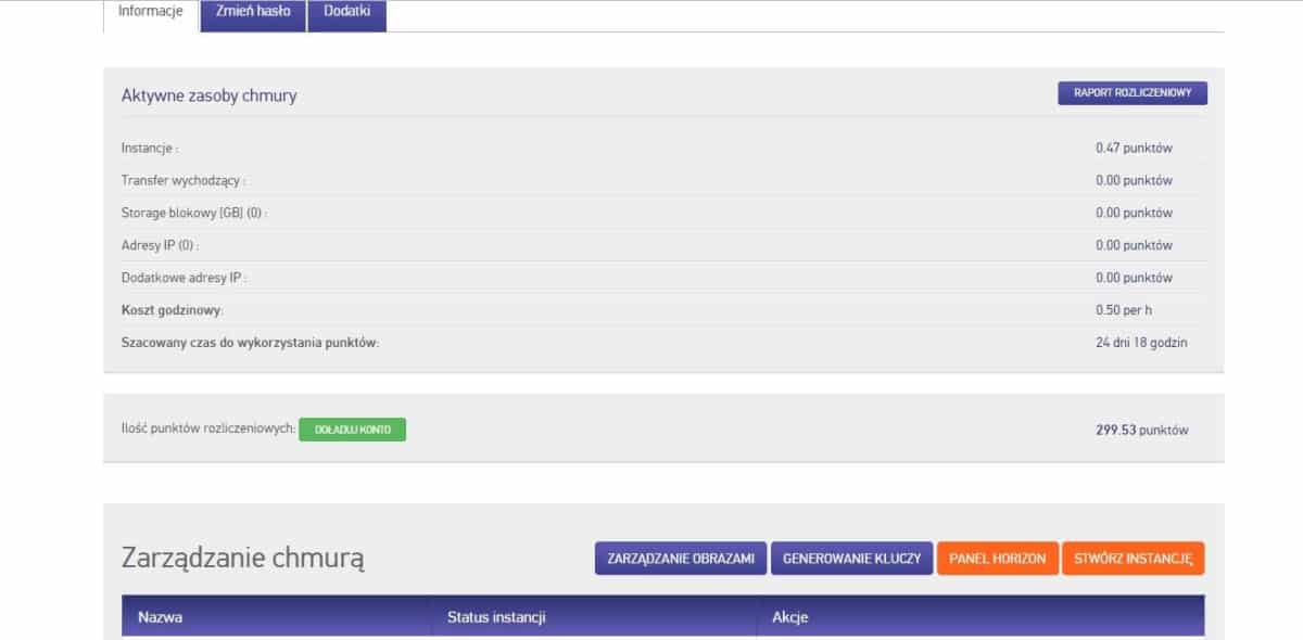 Jak wspomniałem na początku tekstu, dzięki uprzejmości firmy serwery.pl otrzymaliśmy dostęp do testów ich chmury infrastrukturalnej. Wystarczyła chwila, abym docenił kilka ciekawych pomysłów wdrożonych przez ekipę. Pierwszym z nich jest sposób rozliczenia usługi. Nie płacimy jak u innych usługodawców z góry za dany okres rozliczeniowy, a finansujemy nasze zamówienie w formie płatności prepaid (przedpłacowych). Zasada działania jest niezwykle prosta i intuicyjna. Zakupujemy interesującą nas ilość punktów (1 punkt = 1 PLN), a następnie zależnie od wybranych opcji dla naszej chmury, automatycznie pobierane są opłaty za każdą godzinę korzystania z wybranych usług. Przelicznik ten jest mocno konkurencyjny, a przy okazji elastyczny w porównaniu do innych dostępnych w Polsce ofert. Jeżeli mamy wystarczającą ilość środków możliwa jest szybka zmiana konfiguracji naszej chmury na wydajniejszą, a w naszym panelu uzyskamy informacje o ile zwiększona została opłata, a także na jaki czas nasze saldo wystarczy by korzystać z wybranej opcji.