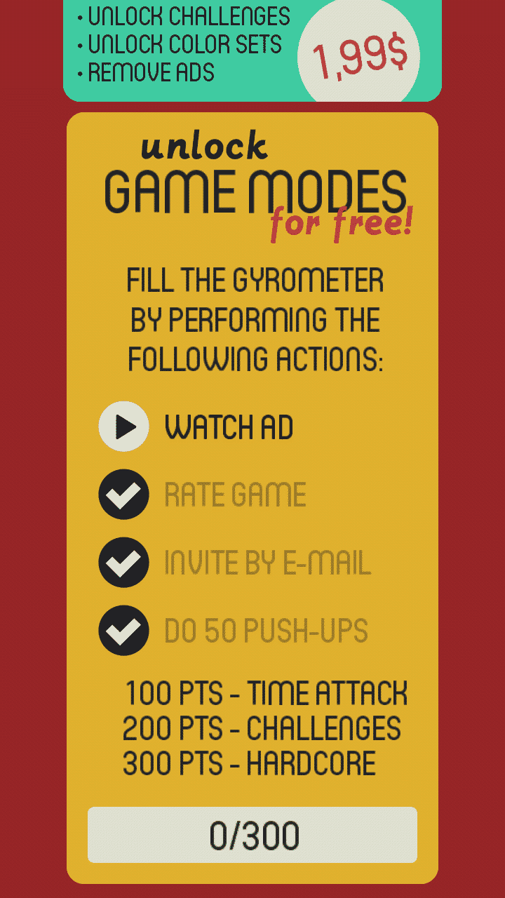 Początkowo Gyro było dostępne w wersji bezpłatnej. Aktualnie dla systemu Android dostępny jest tylko jeden tryb w wersji darmowej, natomiast za dostęp do pozostałej części i możliwość zablokowania reklam przyjdzie nam zapłacić 2 dolary. Jeżeli jednak nie chcemy wydawać pieniędzy to możemy skorzystać z dodatkowej opcji, w której musimy zdobyć 300 punktów oglądając reklamy, oceniając grę, zapraszając znajomych lub robiąc 50 pompek ( ;-) ). Gra była też dostępna wcześniej na iOS jednak twórcy zrezygnowali z umowy z dystrybutorem gry i automatycznie wersja ta zniknęła z AppStore.