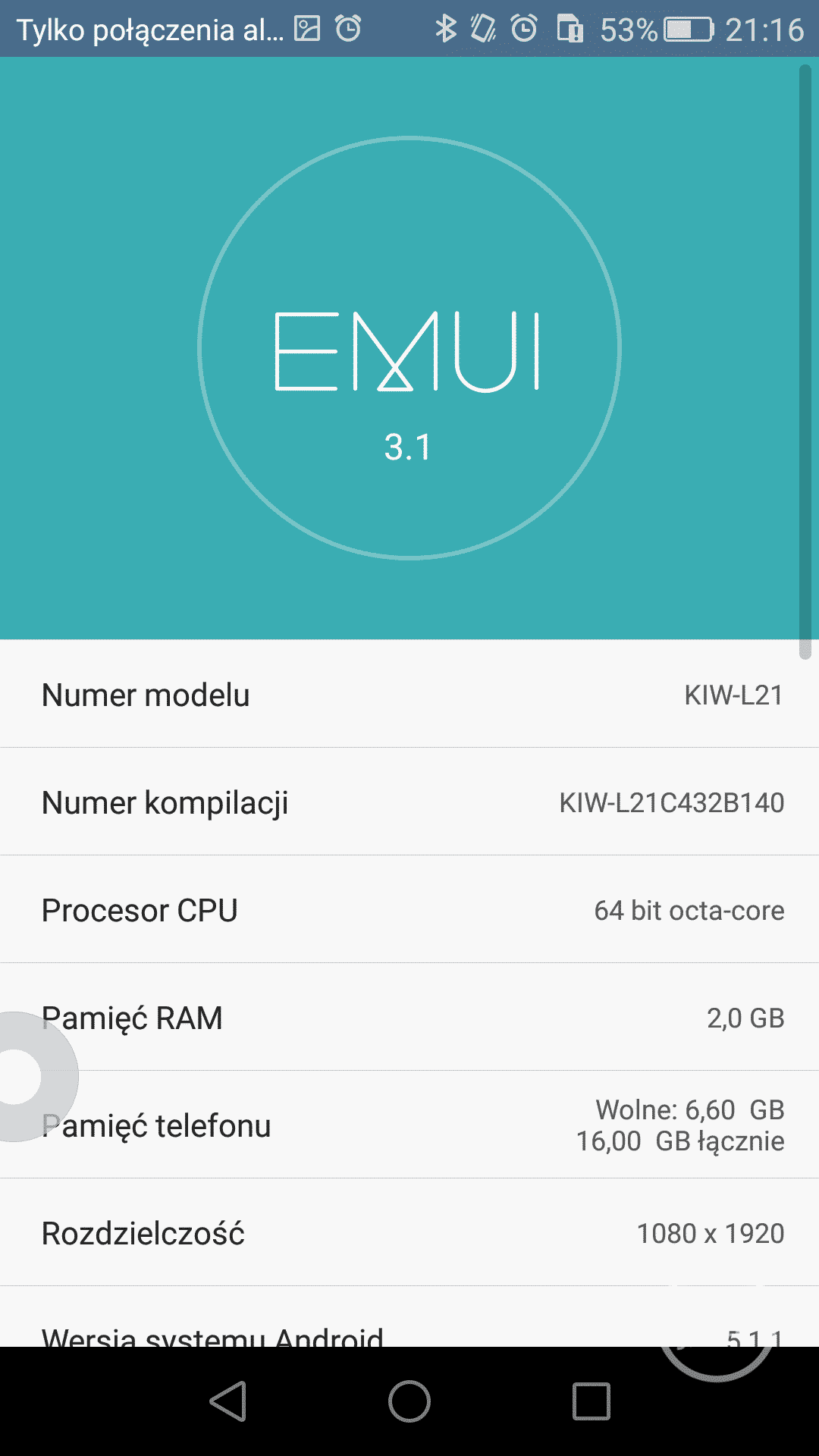 | System operacyjny | Android 5.1 Lollipop + EMUI 3.1 |