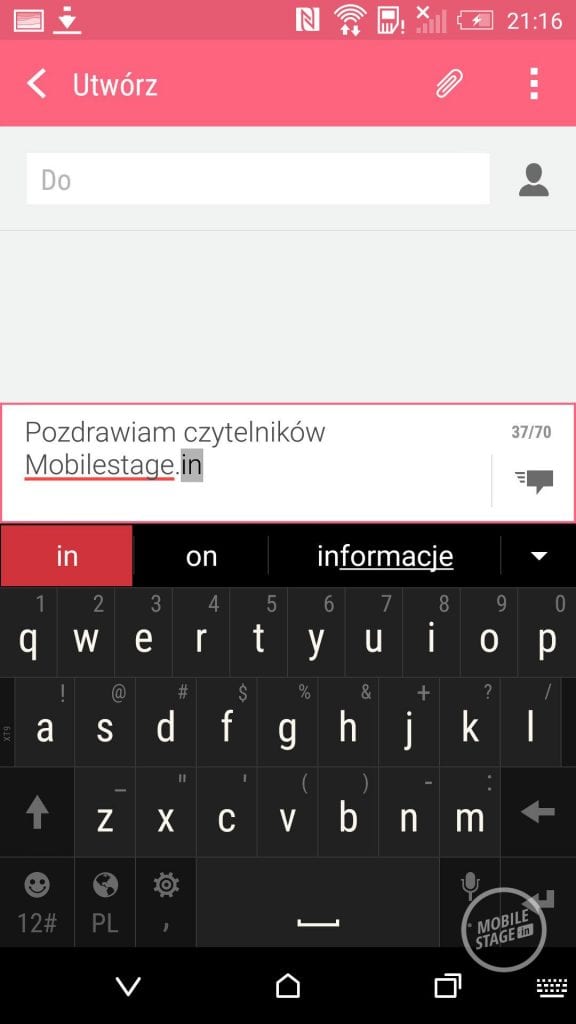 Urządzenie jest typowym monoblokiem o plastikowej konstrukcji, po zakupie, którego możemy zapomnieć o łatwym sposobie na wymianę baterii. Przód telefonu składa się z ekranu o przekątnej równej 5.2-cala. Wszystkie przyciski znajdziemy na ekranie, tak, więc ramka otaczająca ekran jest stosunkowo niewielka (z lewej i z prawej strony ma 4 mm szerokości, z góry 5 mm i od dołu 1 cm), a jedynym elementem, jaki się na niej znajduje się logo HTC w dolnej części. Ponad ekranem na prawie półtora centymetrowym obszarze znajdziemy obiektyw przedniego aparatu ( Mpix), podwójną doświetlającą diodę LED, czujnik zbliżenia i oświetlenia oraz diodę powiadomień. Co ciekawe pomiędzy czarną ramką, a pozostałym białym obszarem mamy milimetrowe rowki, pod którymi kryją się głośniki stereofoniczne. Uważam, że był to świetny pomysł – są one praktycznie niewidoczne, a oferują bardzo dobrą, jakość dźwięku, o czym będę pisał w dalszej części recenzji.
