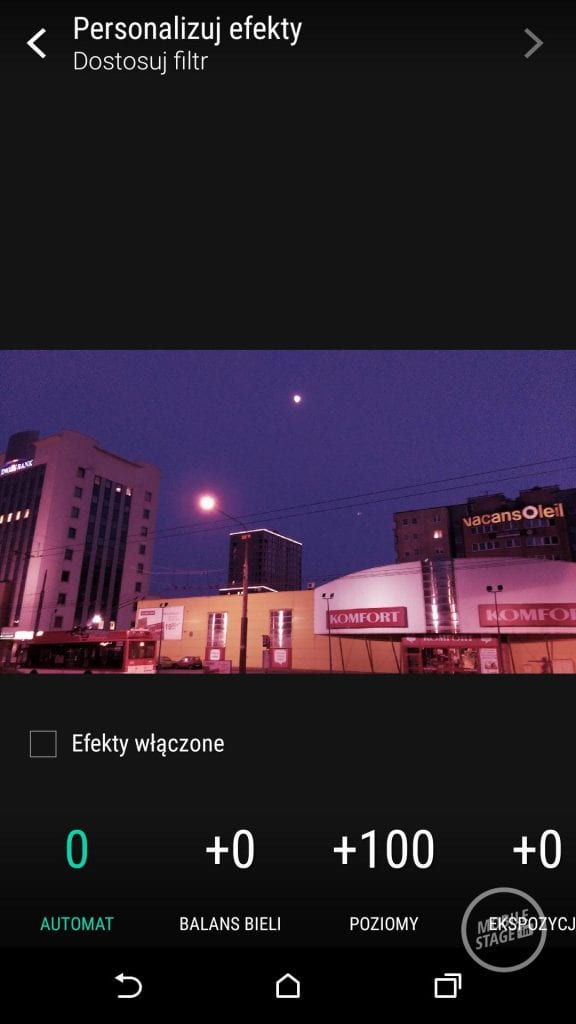 HTC Desire Eye to smartfon stworzony z myślą o fotoamatorach. Posiada dwa aparaty o matrycy 13 Mpix, które oferują szereg rozbudowanych opcji. Najważniejszą z nich jest oczywiście robienie selfie w wysokiej rozdzielczości. Co prawda nie jestem wielkim fanem takich fotografii, dlatego też niestety nie opublikuję swoich „samojebek” na portalu, ani nie znalazłem też żadnej chętnej osoby do zrobienia sobie takich zdjęć, ale jakość ich jest identyczna jak w przypadku fotografii zrobionych aparatem tylnym.