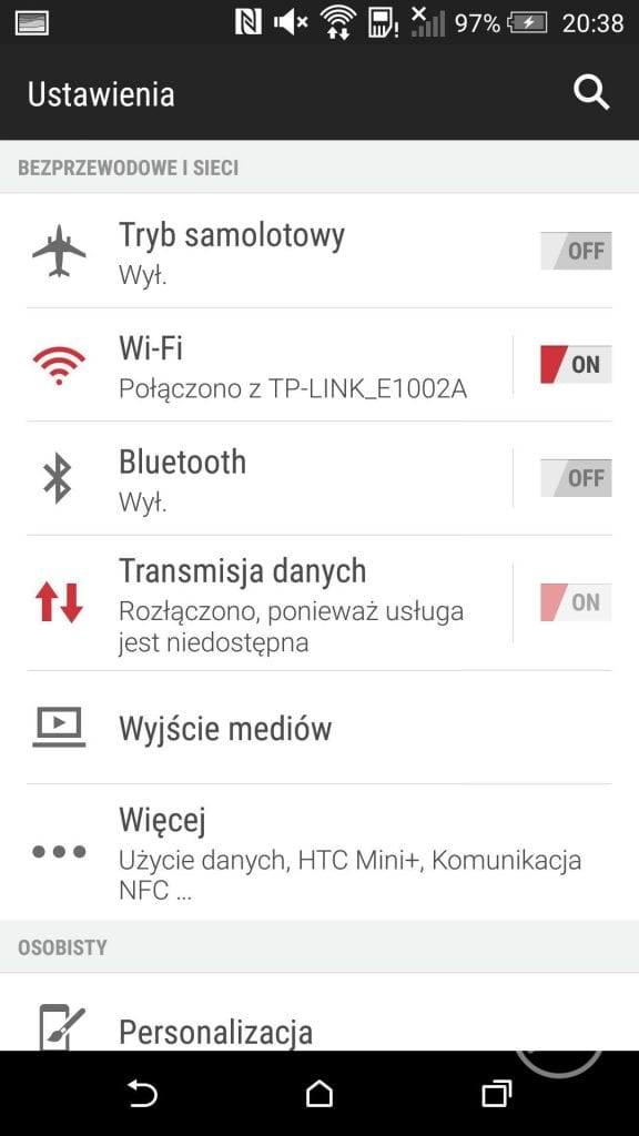HTC Desire Eye oferuje popularne środki łączności. Do naszej dyspozycji oddano Wi-Fi w standardzie 802.11 a/b/g/n z Wi-Fi Direct i DLNA, który oferuje naprawdę świetną szybkość, stabilność połączenia i potrafi wyszukać sieci, które nie wiedziałem, że mnie otaczają. Duże brawa! Nie zabrakło też Bluetooth w wersji 4.0 z A2DP i apt-X. Cieszy zwłaszcza ten ostatni element, który nadal nie jestem standardem w wielu urządzeniach, a znacząco poprawia przyjemność korzystania z głośników i słuchawek Bluetooth. Oprócz tego smartfon raczy nas GPS (Qualcomm IZat Gen8B) z A-GPS i GLONASS. Taki zestaw pozwala na błyskawiczne łapanie fixa i możliwość wykorzystania smartfona jako nawigacji samochodowej (zwłaszcza, że producent dorzuca nam preinstalowane oprogramowanie HTC Car). Nie brak jest wsparcia dla NFC i radia FM. Dodatkowo do naszej dyspozycji oddano złącze microUSB 2.0 (niestety bez OTG) i wejście mini-jack.