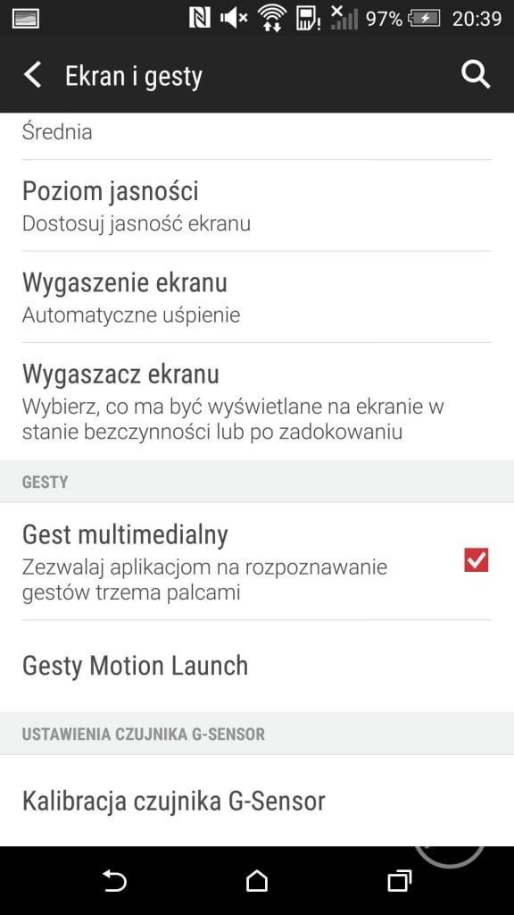 HTC wyposażył również smartfon w dodatkowe ustawienia, wśród nich znajdziemy możliwość konfiguracji HTC Mini+ oraz gesty Motion Launch, za pomocą których nasza praca ze smartfonem może być wydajniejsza poprzez szybkie wydawanie poleceń ruchem dłoni. Wśród dostępnych opcji znajdziemy możliwość dotknięcia dwukrotnie ekranu, aby go wybudzić, w przypadku wyłączonego ekranu po podniesieniu telefonu do pionu i przesunięciu palcem w lewo wznowimy działanie rządzenia i uruchomimy panel widżetów, zaś po przesunięciu w prawo uruchomimy BlinkFeed, po przesunięciu w górę odblokujemy telefon, natomiast po kliknięciu na przycisk głośności przejdziemy do aparatu.