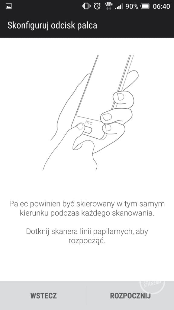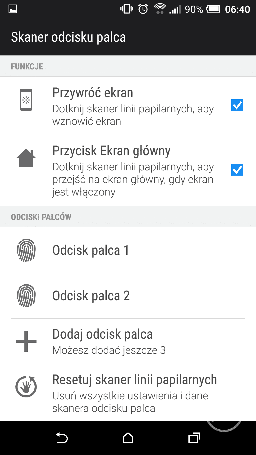 HTC One A9 został wyposażony w czytnik linii papilarnych, który działał niestety kapryśnie w moim przypadku. Dosyć często zdarzało się, że należało kilkukrotnie przykładać palec zanim telefon został odblokowany. Urządzenie może mieć w pamięci maksymalnie 5 zapisanych odcisków palców.