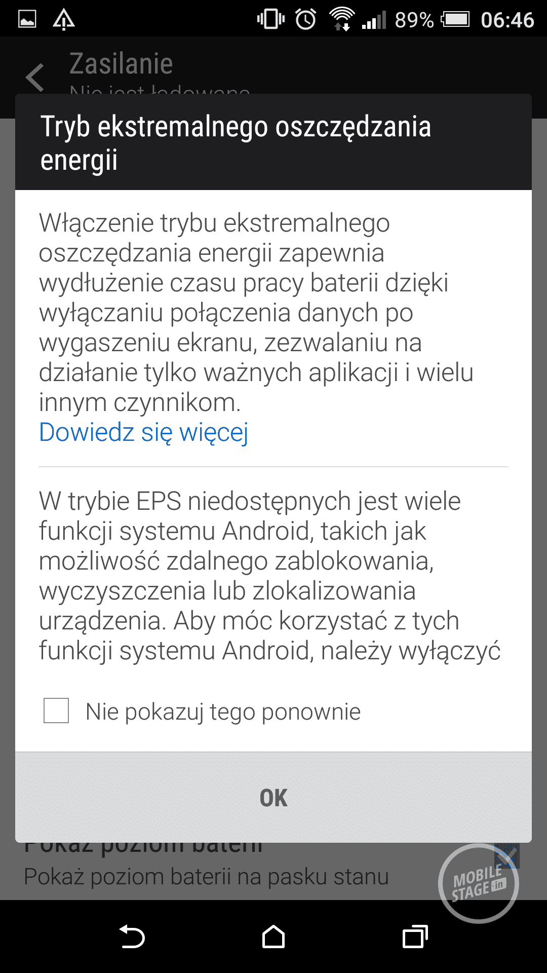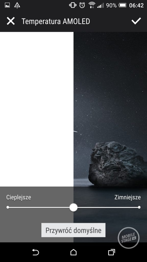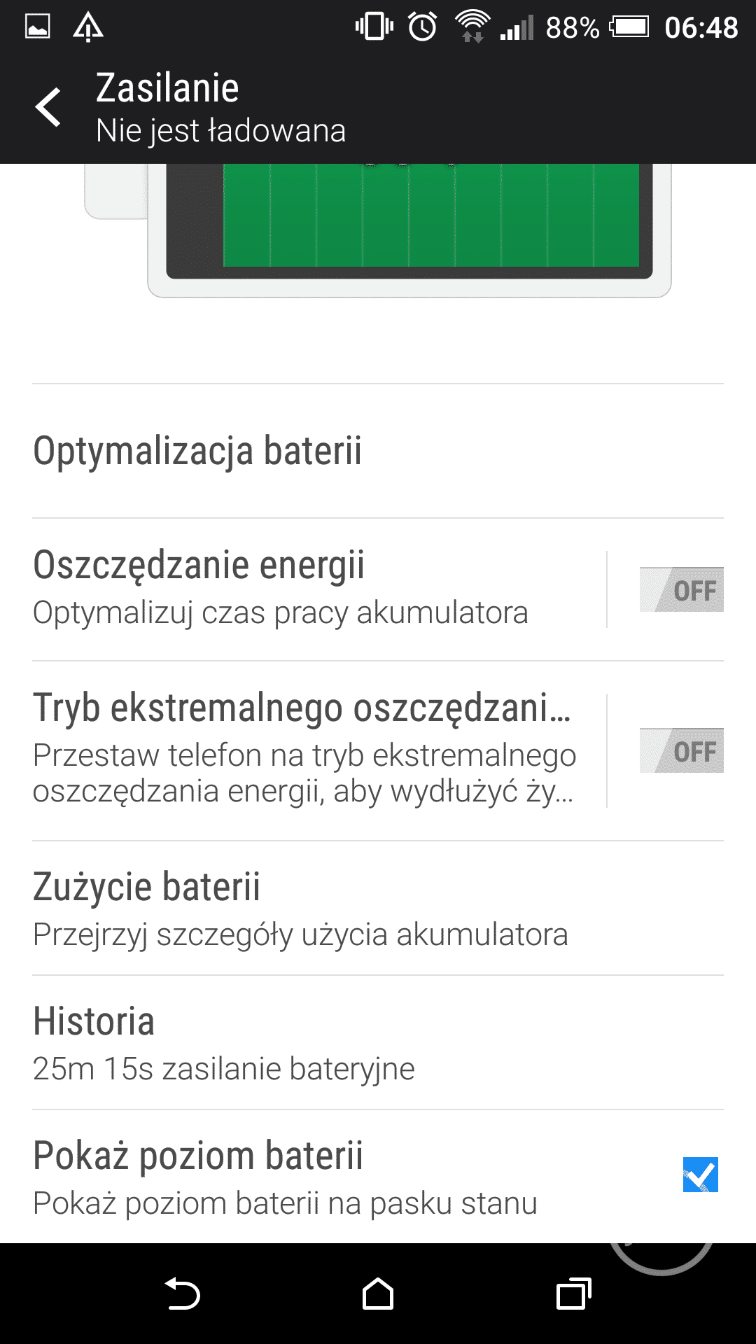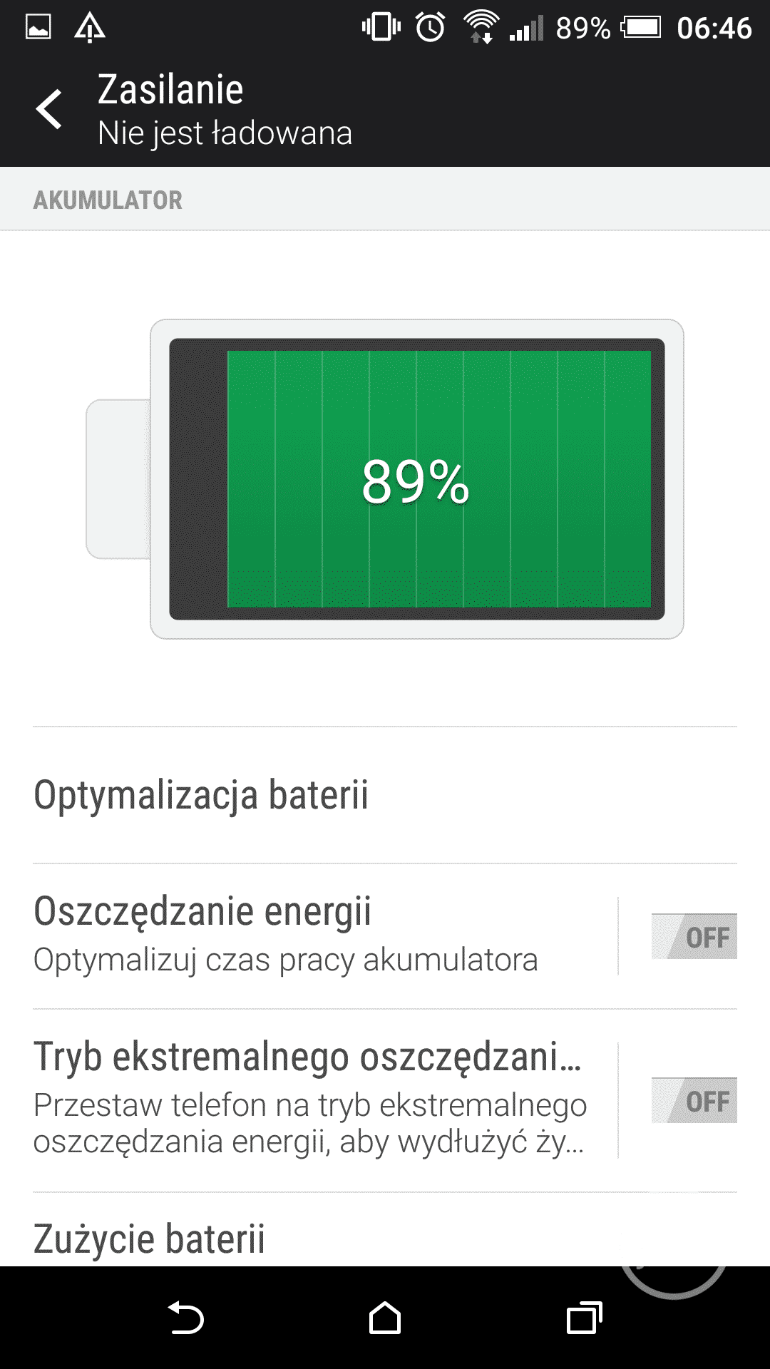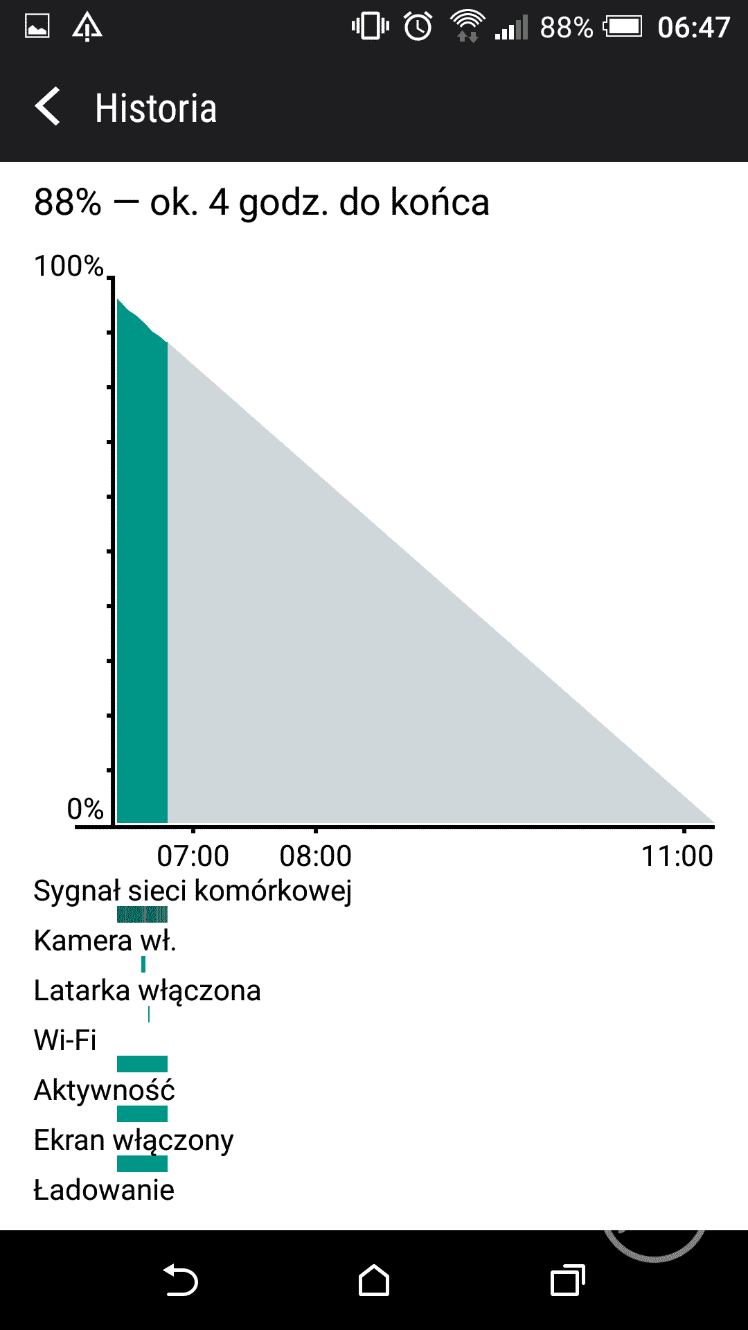 Jasność ekranu jest przeciętna, co prawda w słoneczny dzień można dostrzec wyświetlane treści, ale na rynku znajduje się ogromna ilość smartfonów z niższej półki cenowej o dużo wyższej jasności wyświetlacza. Na pochwałę zasługuje fakt, że czujnik światła zamontowany obok przedniego aparatu fotograficznego dopasowuje odpowiedni poziom podświetlenia wyświetlacza w błyskawicznym tempie.