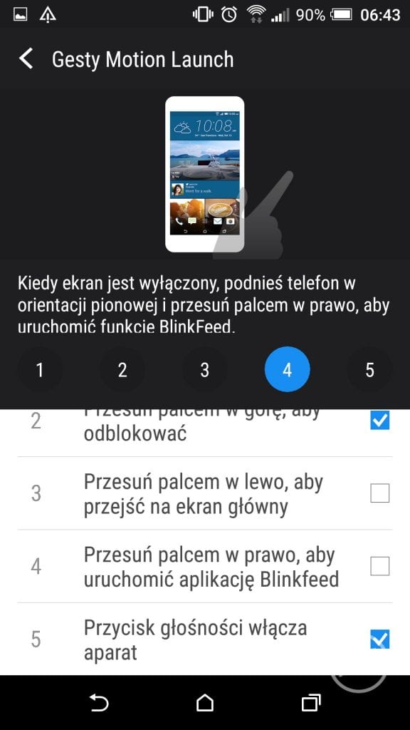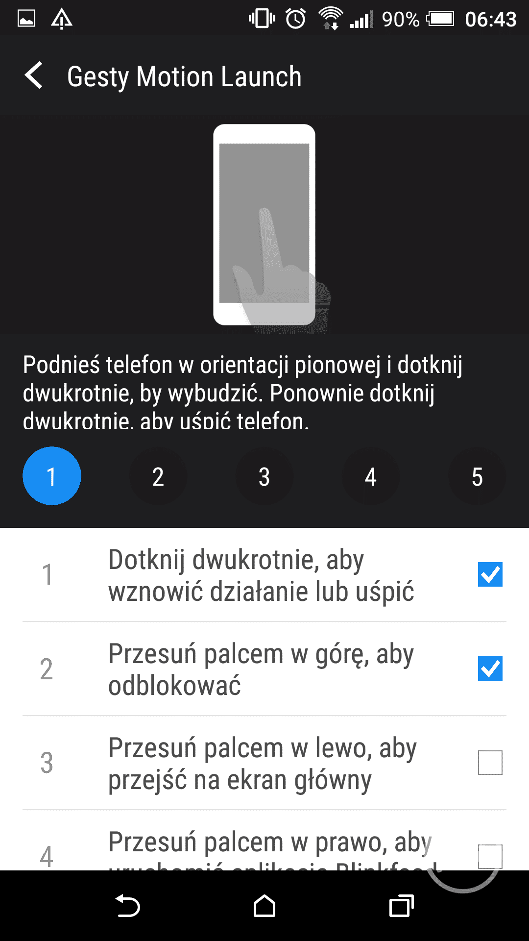 Telefonem można sterować za pomocą gestów. Nie mogło zabraknąć gestu podwójnego naciśnięcia w celu odblokowywania ekranu. Za pomocą przesunięcia palcem w lewo, w prawo lub od góry do dołu po zablokowanym ekranie można bezpośrednio przejść do ekranu głównego, do BlinkFeed lub po prostu odblokować telefon.