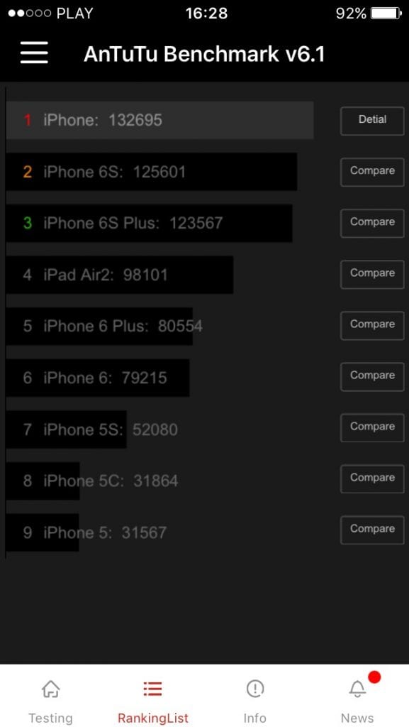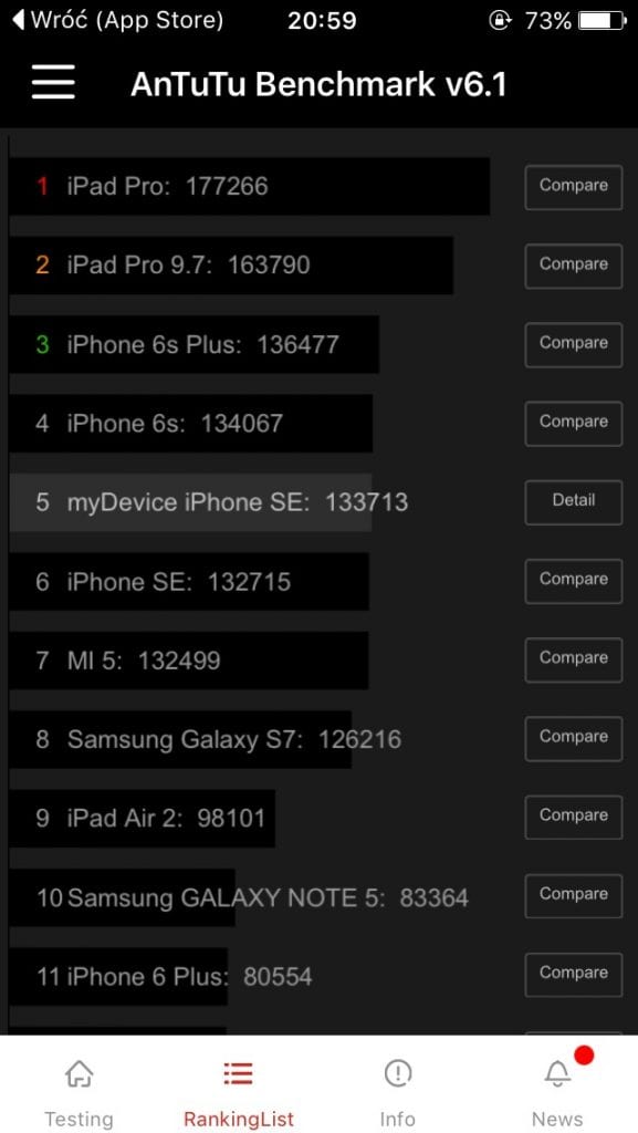 Zastosowanie w iPhone SE podzespołów obecnych w iPhone 6s oraz mniejsza rozdzielczość ekranu niż ma to miejsce w przypadku jego starszego brata powinny zagwarantować bezproblemową i komfortową pracę. Tak też jest w rzeczywistości – podczas przeprowadzania testów nie doświadczyłem żadnych problemów z wydajnością, co potwierdzają wyniki osiągnięte w dwóch najpopularniejszych benchmarkach. iPhone SE prześcignął w nich wszystkie pozostałe dostępne na rynku iPhone’y, co nie jest zaskoczeniem w obliczu jego specyfikacji technicznej. Niestety benchmark AnTuTu dostarczył kilku odmiennych wartości (zarówno w przypadku omawianego iPhone SE, jak i pozostałych urządzeń), przez co ciężko jednoznacznie odnieść się do wyników testów przeprowadzonych z jego wykorzystaniem. Zabrane dane publikuję jednak poniżej.