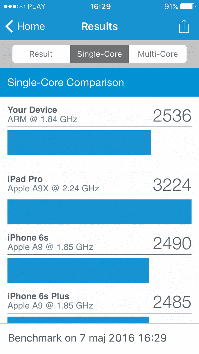 W teście baterii oferowanym przez Geekbench urządzenie wytrzymało nieco ponad 6h, co wskazuje na wydajność podobną do iPhone 6s Plus.