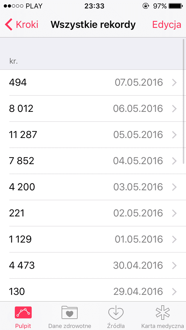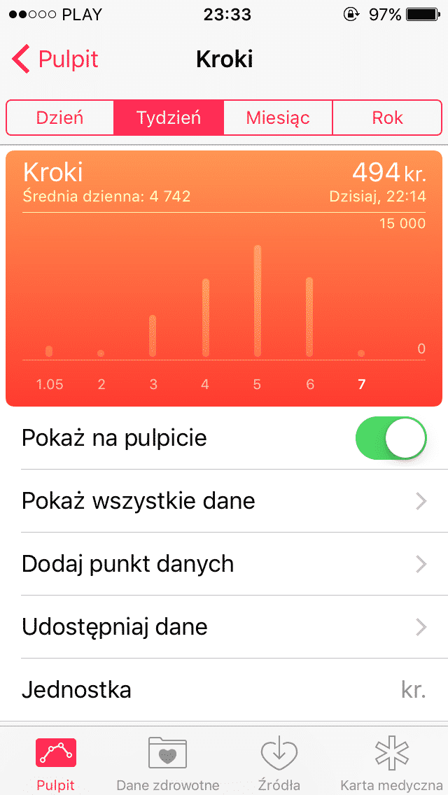 Kolejną ciekawą aplikacją jest Zdrowie. Jak sama nazwa wskazuje, jej głównym zastosowaniem jest zbieranie różnorodnych danych dot. naszego stanu zdrowia, aktywności fizycznej itp. – oczywiście do wykonywania niektórych pomiarów konieczne jest zastosowanie zewnętrznych urządzeń, takich jak Apple Watch, czy chociażby Xiaomi Mi Band.