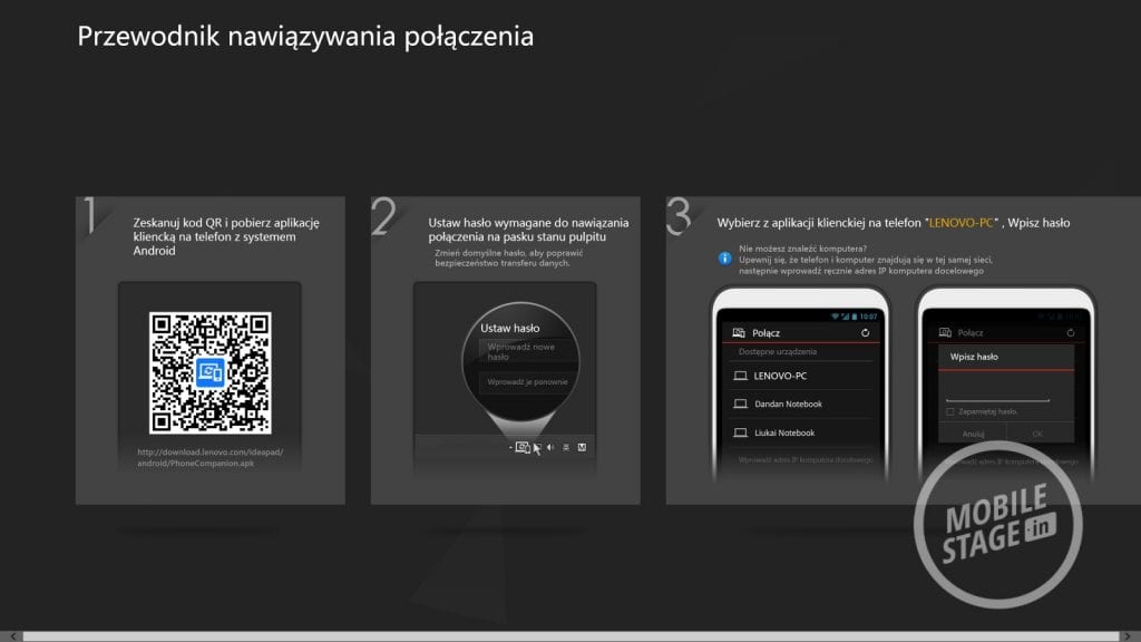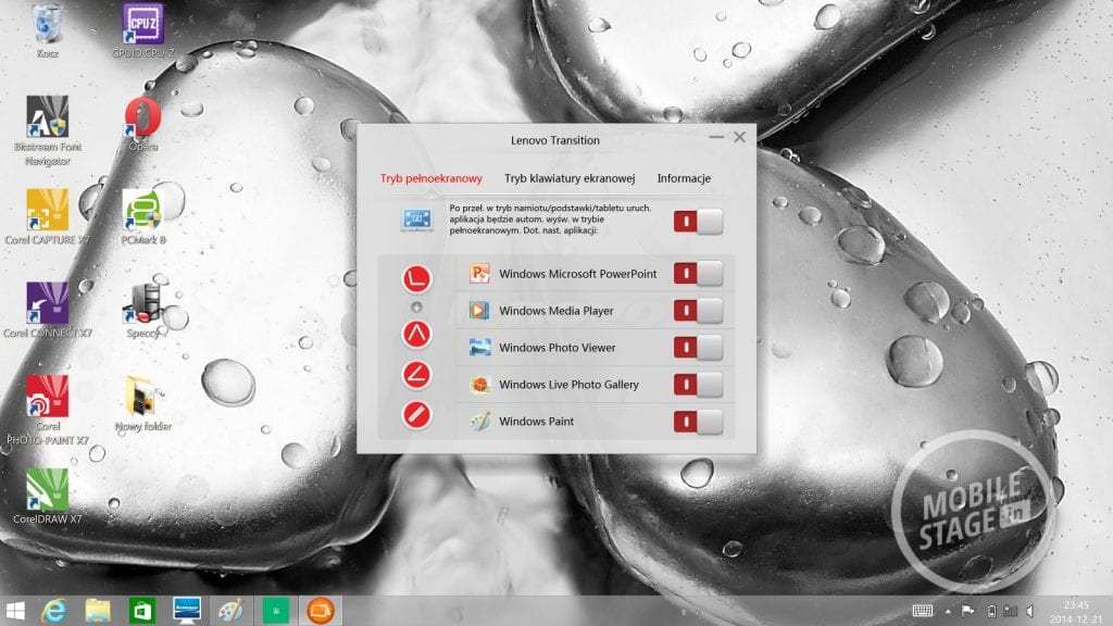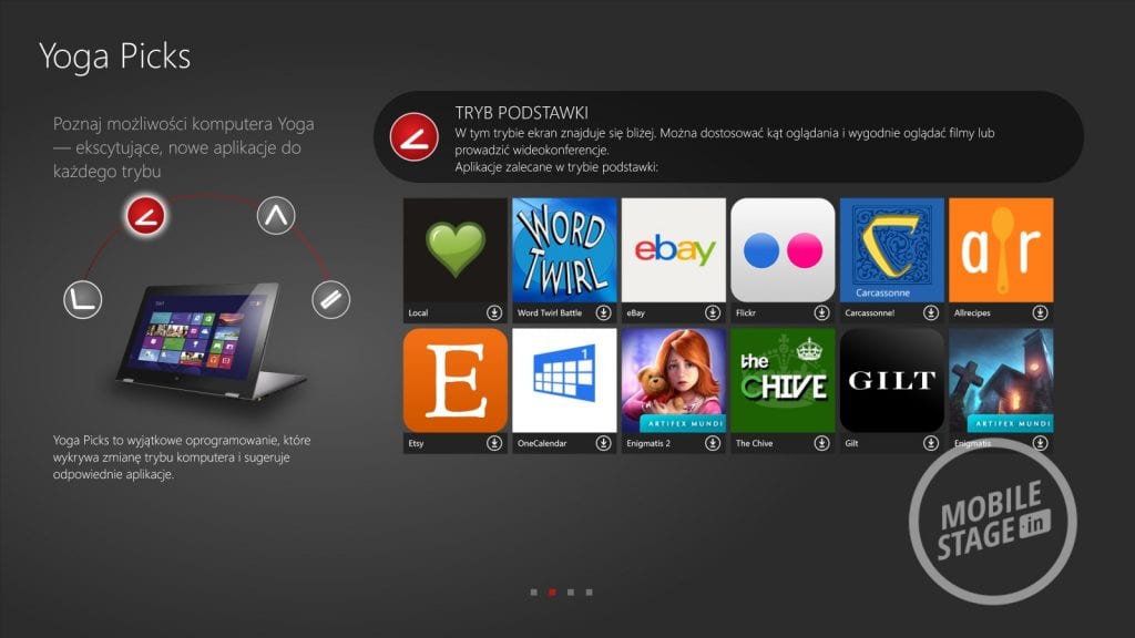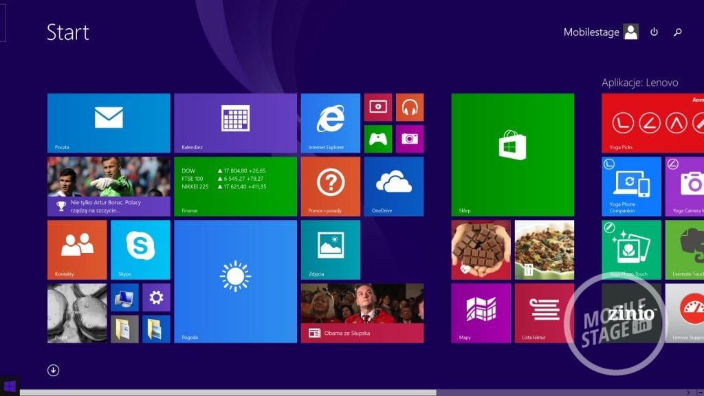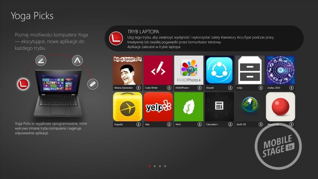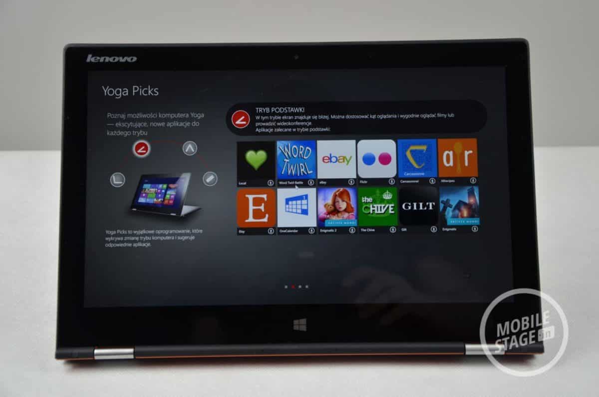 Lenovo Yoga 2 Pro działa pod kontrolą systemu Windows 8.1, który wzbogacony został przez kilka dedykowanych aplikacji prosto od producenta. Wśród nich znajdziemy: Yoga Picks (która informuje nas jakie aplikacje polecane są przez firmę dla wybranego trybu pracy), Hightail (backup plików pomiędzy urządzeniami Lenovo), Companion (który służy jako centrum dowodzenia – wyświetla informacje o urządzeniu, nowości, forum wsparcia itd.), Lenovo Transition (która pozwala zautomatyzować naszą pracę uruchamiając wybrane aplikacje po przełączeniu się do określonego trybu), Yoga Phone Companion (łączenie ultrabooka ze smartfonem lub tabletem od Lenovo), Lenovo Motion Control (sterowanie komputerem za pomocą gestów – bardzo ciekawe możliwości, choć ograniczone do wybranych aplikacji i zadań), VeriFace (logowanie się do systemu za pomocą skanowania twarzy – w dobrym oświetleniu działa bez zarzutu, niestety w nocy musimy i tak wpisywać hasło przez co logowanie trwa dłużej), Yoga Photo Touch (dodawanie ramek i efektów do zdjęć) oraz Dolby Digital Manager (podrasowanie dźwięku).