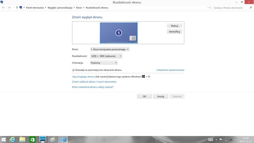 Lenovo Yoga Pro 2 został wyposażony w 13.3-calowy ekran przygotowany przez Samsunga. Jest to model LTN133YL01L01, który umożliwia nam wyświetlanie obraz w rozdzielczości 3200×1800 pikseli, co daje nam zagęszczenie pikseli równe 276 ppi. Niestety nie zawsze wykorzystanie takiego wyświetlacza jest praktyczne.