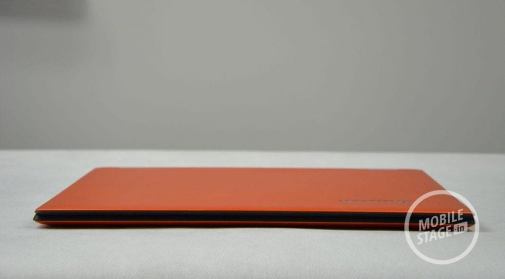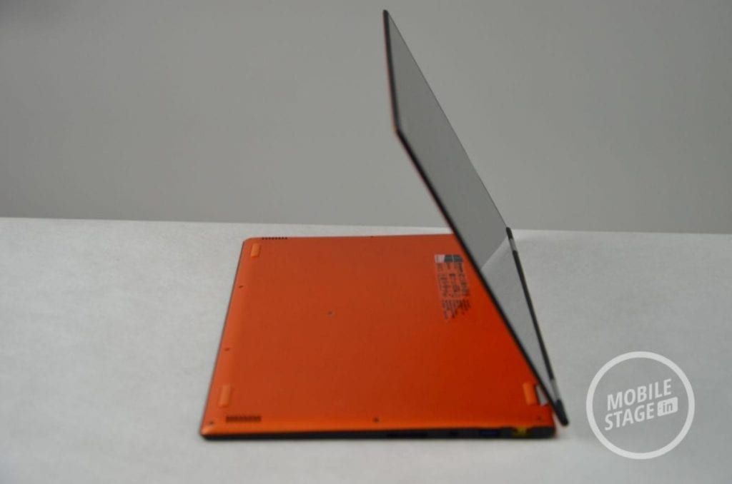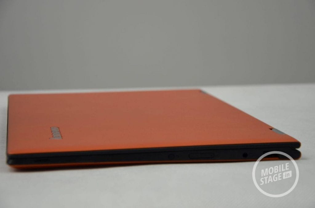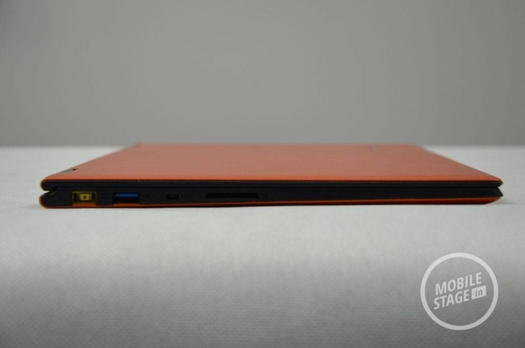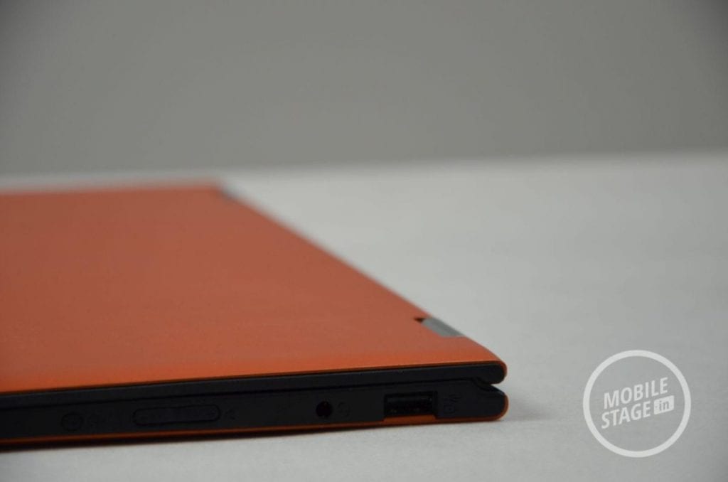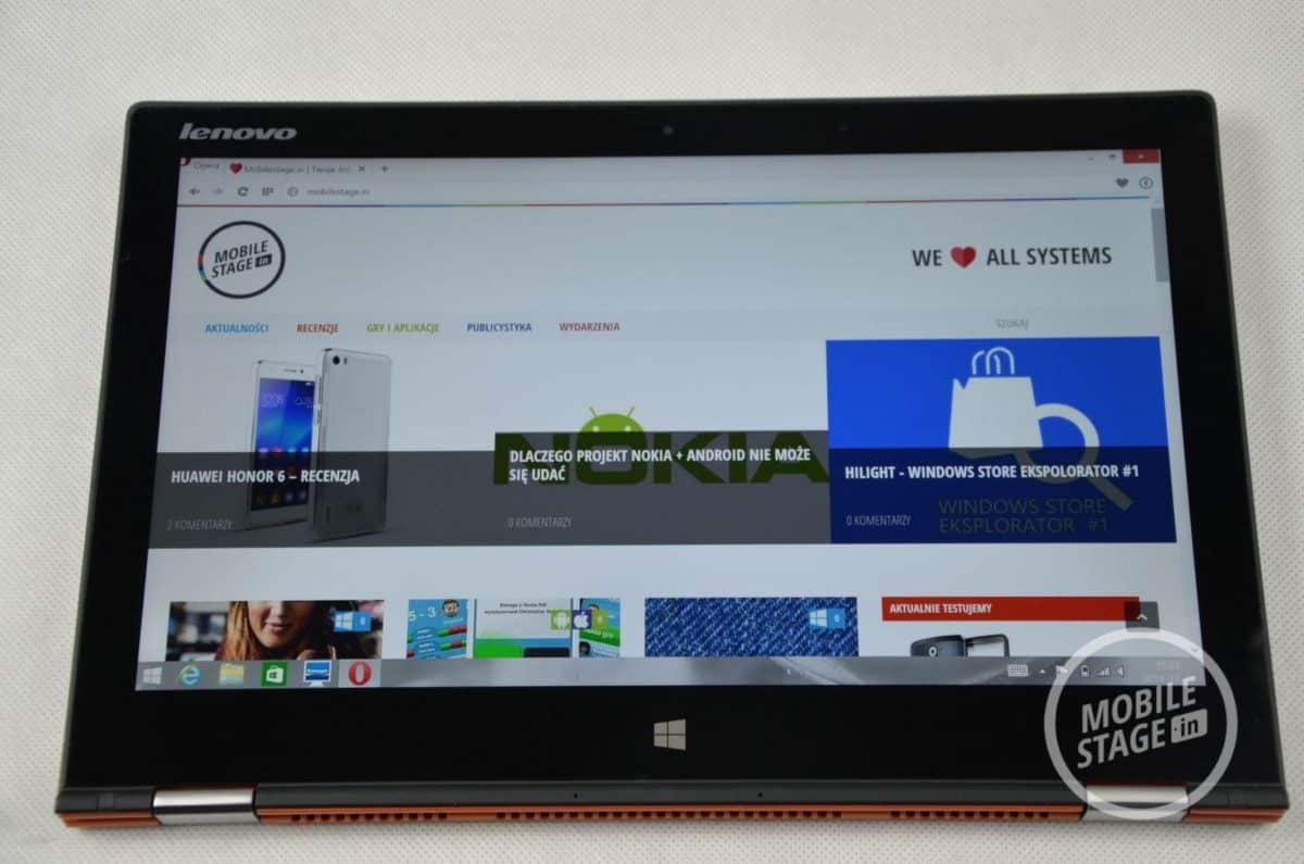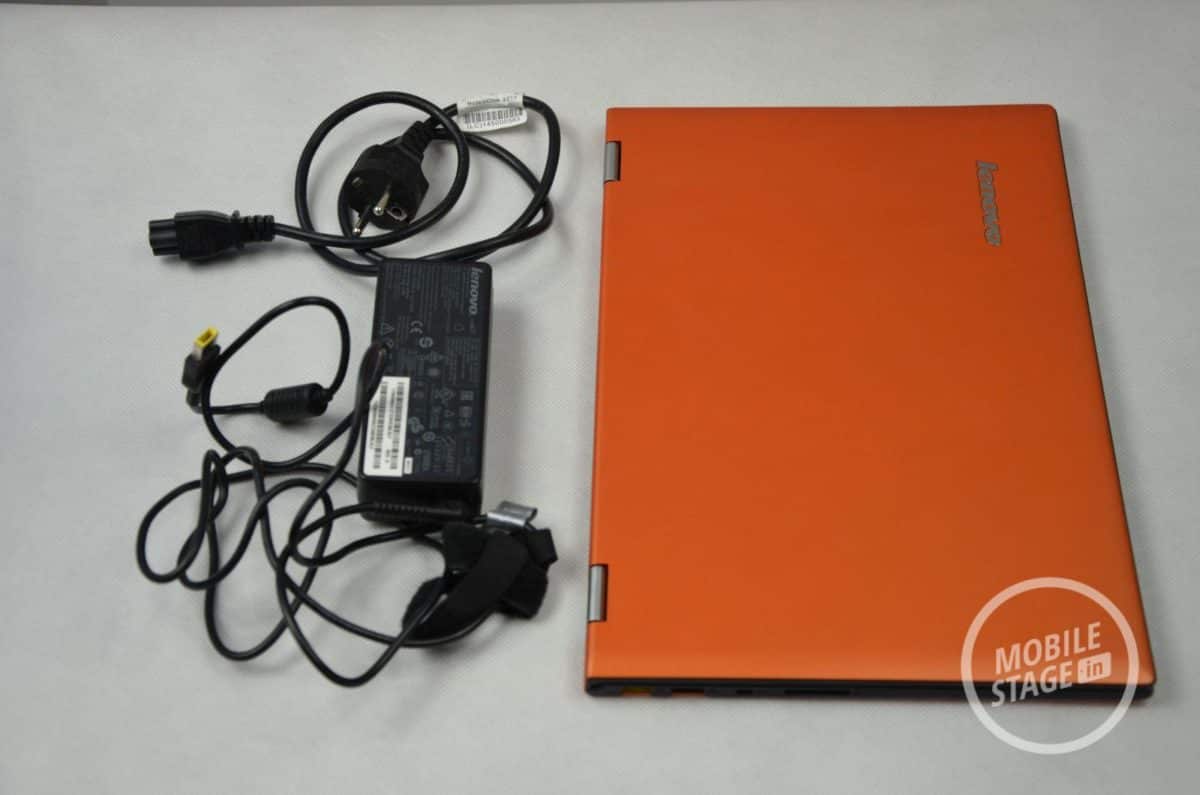 Oprócz samego urządzenia do naszej dyspozycji oddano zasilacz oraz papiery, nad którą nie będziemy się za bardzo rozwodzić. Zestaw ten jest zatem dość ubogi. Mimo to, chwilę po uruchomieniu urządzenie jest gotowe do pracy. Lenovo Yoga 2 Pro posiada standardowy (jak na konwertowalny ultrabook) wyświetlacz o przekątnej 13.3-cala. Tuż pod nim mamy dostęp do dotykowego przycisku Windows, zaś nad ekranem producent umieścił kamerkę oraz swoje logo (abyśmy zapewne zapamiętali dokładnie jego nazwę). Zewnętrzna część wyświetlacza składa się z pomarańczowego materiału, który przypomina przyjemne w dotyku tworzywo sztuczne o konsystencji matowej gumy. Zdecydowanym plusem takiego rozwiązania jest fakt, iż urządzenie nie ślizga się. Materiał ów charakteryzuje się bardzo dobrą przyczepnością. Wewnętrza część obudowy również została pokryta tworzywem sztucznym z tą różnicą, że tekstura w tej części była bardziej chropowata i lekko przypominała skórę.