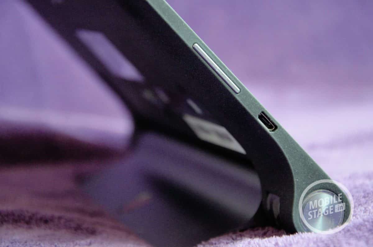 Tylni panel pokryty został tworzywem sztucznym o przyjemnej, matowej strukturze, która pozwala na pewne trzymanie go w dłoni bez obawy o możliwość wyślizgnięcia się. Na prawym boku producent umieścił mikrofon oraz wejście mini-jack, zaś na lewym port micro USB 2.0 oraz przycisk regulacji głośności i zasilania.