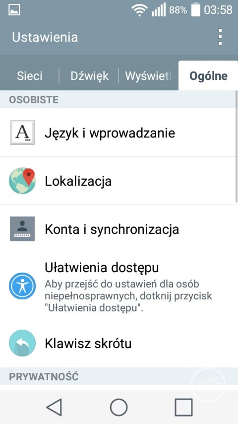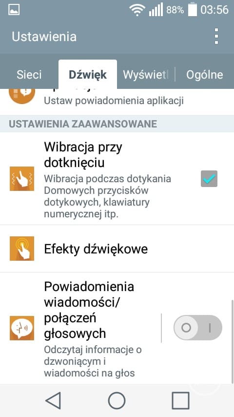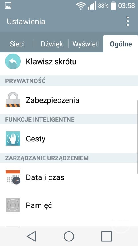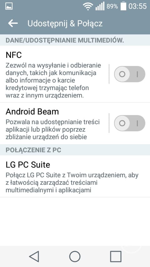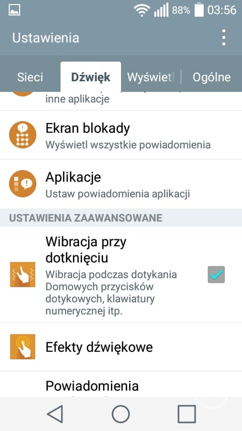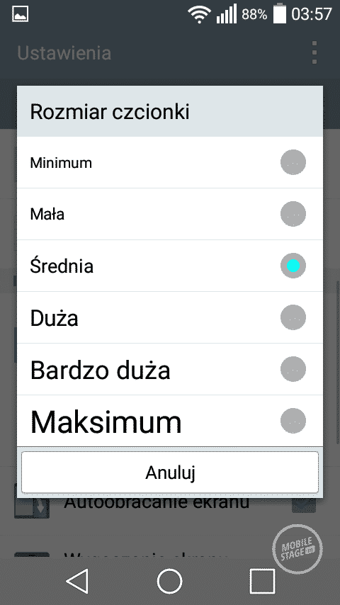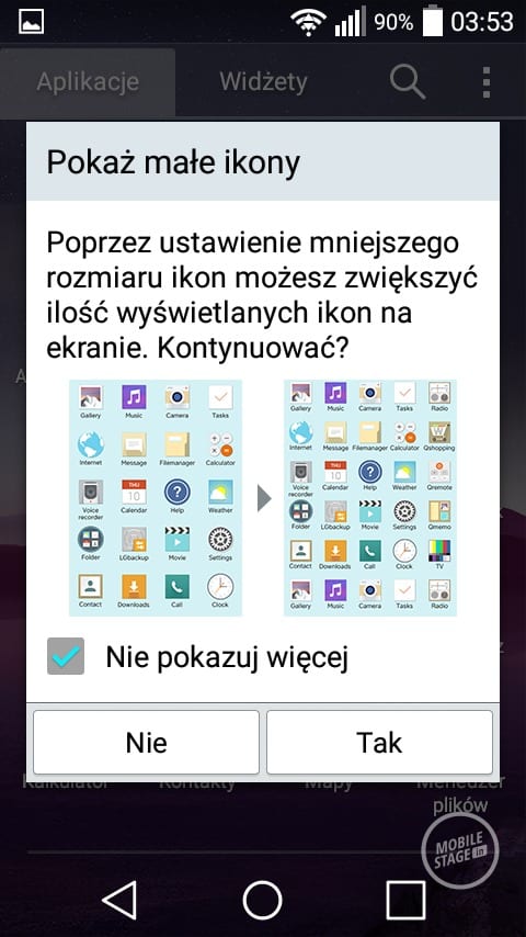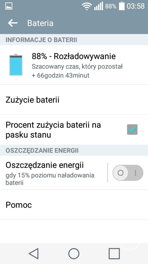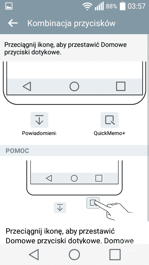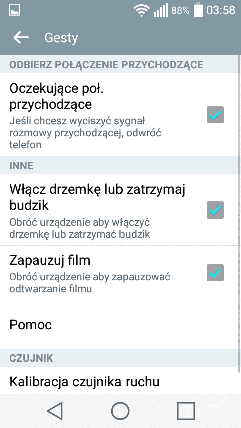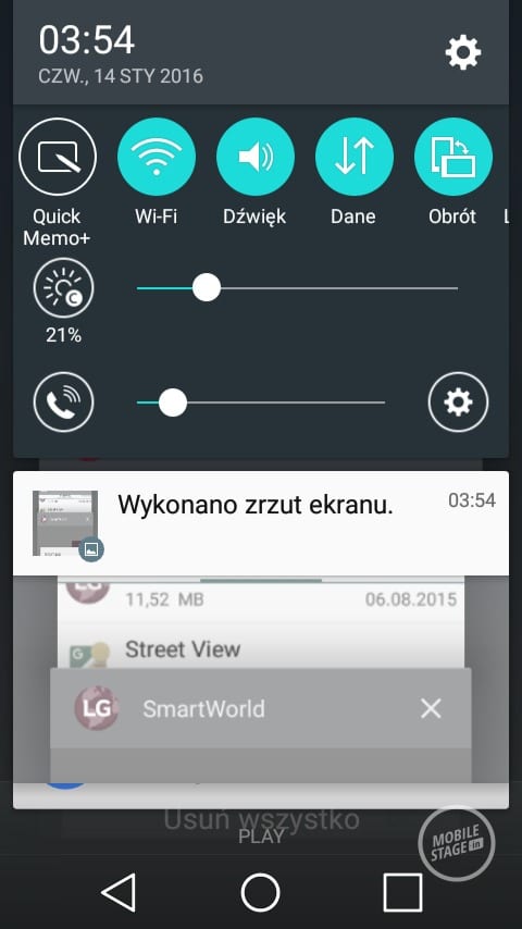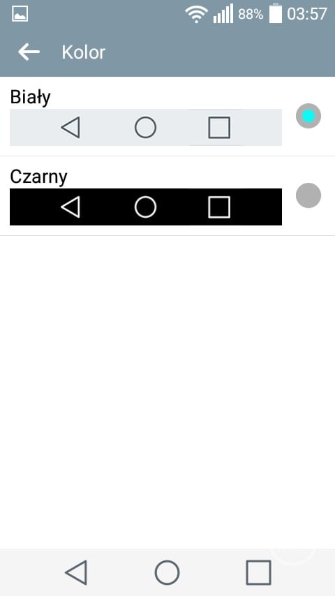 Pierwszym, ciekawym rozwiązaniem charakterystycznym dla LG jest możliwość dopasowania ilości oraz rodzaju przycisków nawigacyjnych znajdujących się pod ekranem. Pasek powiadomień również uległ zmianom. W jego górnej części znajduje się wiele ikonek z ustawieniami, których ilość możemy dowolnie zmieniać. Nawigacja pomiędzy poszczególnymi ikonkami odbywa się w poziomie. Charakterystycznym elementem w pasku powiadomień jest suwak jasności, który jest bardzo przydatny z uwagi na brak wbudowanego czujnika świtała. Co prawda LG wprowadziło możliwość automatycznego zmniejszenia jasności ekranu pomiędzy godziną 24 a 6, ale jest to według mnie połowiczne rozwiązanie. Po pierwsze nie można zmienić godzin, w których ekran się przyciemni. W dodatku nie jest to zbyt wygodne rozwiązanie, ponieważ ukryto je w ustawieniach i nie można go szybko zmienić z poziomu paska powiadomień.