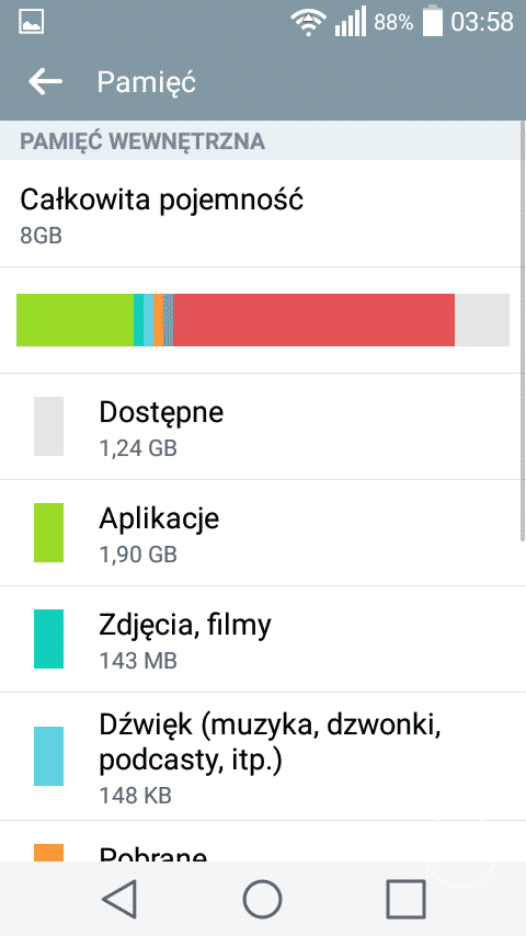 Dosyć dużą wadą recenzowanego urządzenia jest zbyt mała pojemność pamięci wewnętrznej. Użytkownik Leona ma do dyspozycji jedynie 8GB pamięci wbudowanej, z czego dla użytkownika pozostaje ok 3,5 GB. Do ceny recenzowanego urządzenia należy zatem doliczyć koszt zakupu karty pamięci microSD, bez której praca z tym telefonem jest wyjątkowo utrudniona.