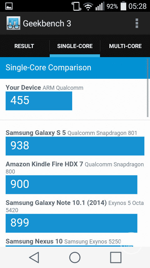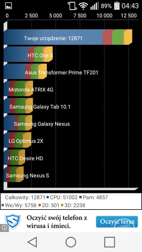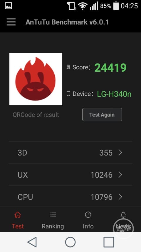 Wyświetlacz to matryca IPS o szerokich kątach widzenia. Ekrany IPS w smartfonach LG należą do ścisłej czołówki. Na pochwałę zasługuje znakomite odwzorowanie barw oraz wysoki poziom kontrastu. Kąty widzenia są bardzo dobre, dzięki czemu bez przeszkód możemy wspólnie ze znajomymi oglądać zdjęcia lub filmy. Kolor biały jest odwzorowany idealnie, natomiast kolor czarny posiada szary odcień. Jasność wyświetlacza to kolejna mocna strona recenzowanego urządzenia, w słoneczny dzień czytelność jest bardzo dobra. Leona pozbawiono niestety czujnika świtała, przez co przy zmianie warunków oświetleniowych za każdym razem należy ręcznie zmieniać poziom jasności matrycy.