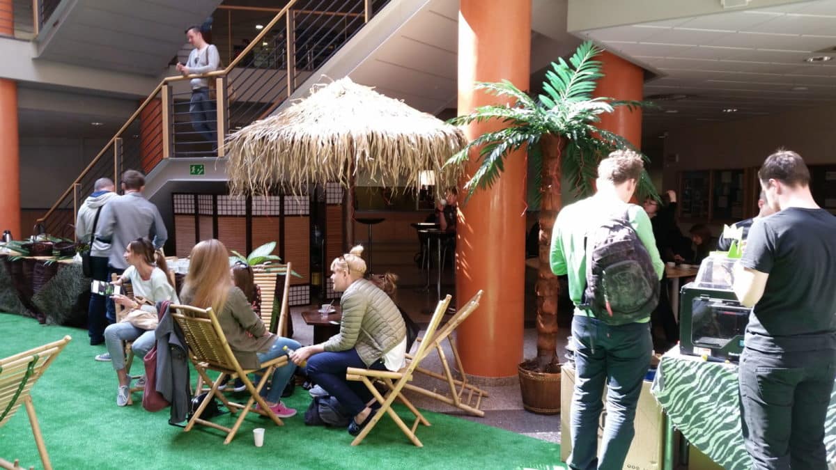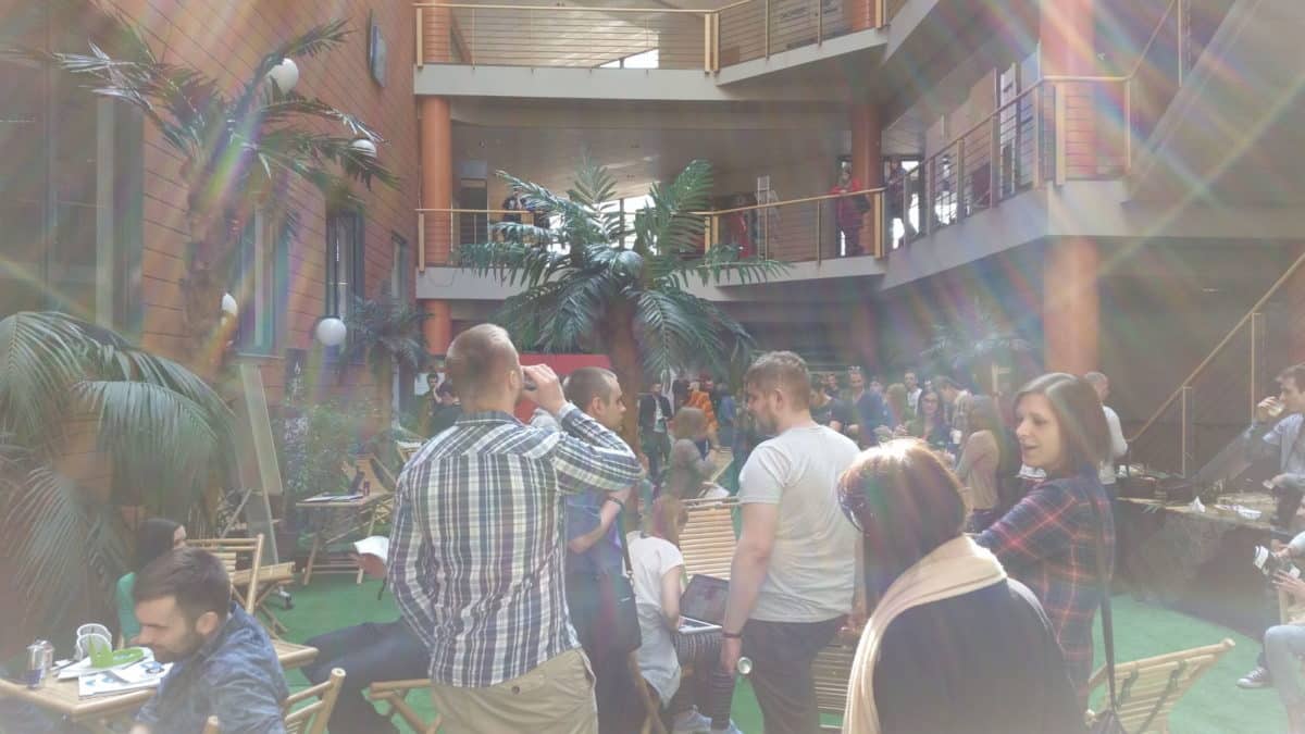 Po dość długiej i męczącej nocnej podróży do Łodzi udało się nam zdążyć przed pierwszym blokiem prelegentów. Pierwsze co nas zaskoczyło to świetna atmosfera. Mimo, iż konferencja odbywała się na Wydziale Zarządzania Uniwersytetu Łódzkiego i musiała wykorzystać dostępne jej miejsce (które oczywiście było na swój sposób ograniczone) to pomysł na jego zagospodarowanie uważam za świetny. Palemki, leżaki, hamaki, drink bar oraz sporych rozmiarów kawiarnia zbudowały fajny klimat, dzięki czemu dość łatwo można było się wczuć w tematykę konferencji.