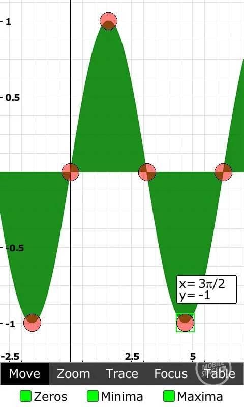 Aby lepiej obejrzeć wykres wystarczy dwukrotnie nacisnąć na jego miniaturkę. W pełnoekranowym podglądzie możemy przesuwać i powiększać uzyskany wynik. Widzimy również zaznaczone ekstrema i miejsca zerowe. Przy wykresach trójwymiarowych dochodzi opcja obracania i zbliżania się do konkretnych fragmentów.