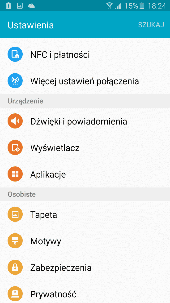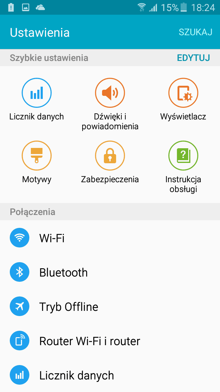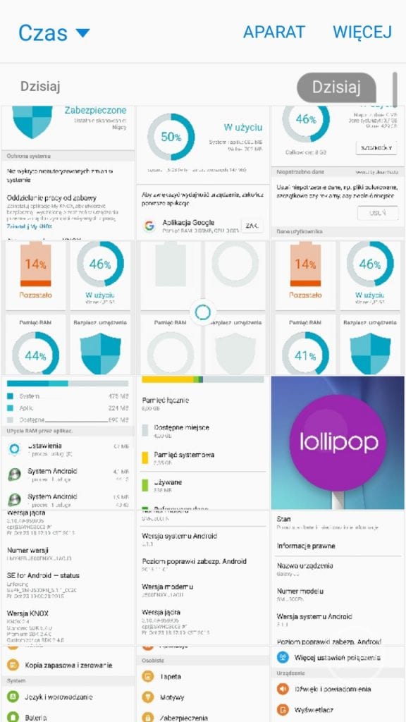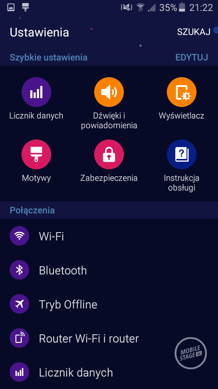Nakładka TouchWiz w tej wersji oferuje najbardziej przejrzyste menu ustawień jakie w życiu wydziałem. Na samej górze mamy skróty do najważniejszych opcji takich jak: licznik danych, dźwięki, wyświetlacz, motywy, zabezpieczenia i instrukcję. Zakładki, z których korzysta się zdecydowanie najczęściej są na początku menu, dzięki czemu nie trzeba go przewijać aby się do nich dostać. Reszta opcji podzielona została na kategorie, z których każda dodatkowo ma swój własny kolor. Ułożone zostały jedna pod druga, wiec dostęp do każdej z nich jest bardzo szybki.