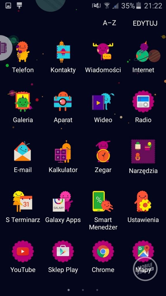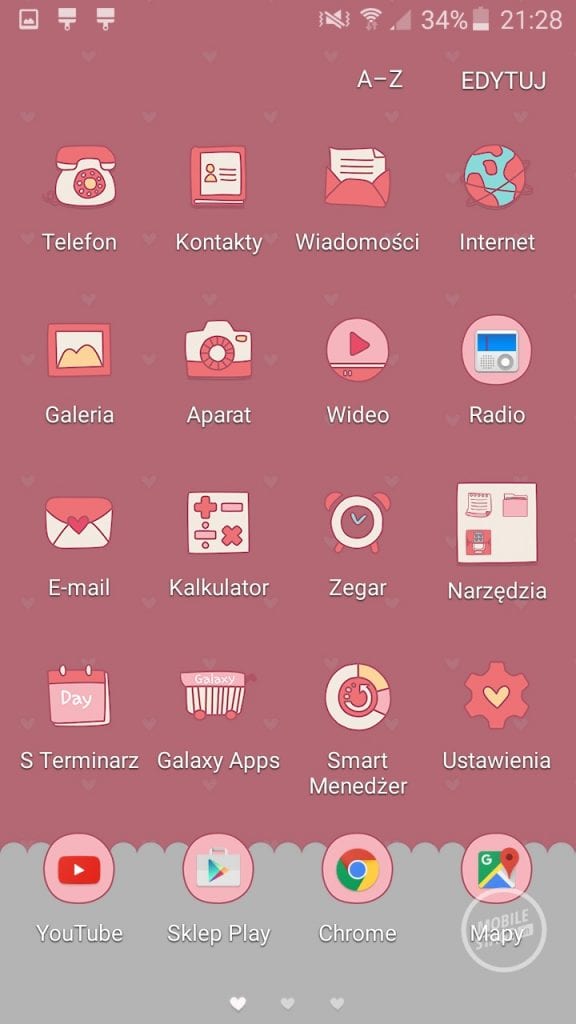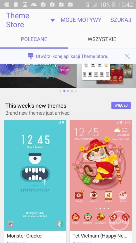 TouchWiz pozwala na zmianę wyglądu w bardzo prosty sposób. Wystarczy, że w o opcjach znajdziemy zakładkę “motywy”. Znajdują się tam 3 motywy proponowane przez producenta, ale jeżeli chcemy więcej możemy odwiedzić sklep, w którym znajdziemy masę nowych, niekoniecznie płatnych. Dzięki nim możemy całkowicie zmienić wygląd systemu, poprzez zmianę tapety, kolorystyki czy też dźwięków.
