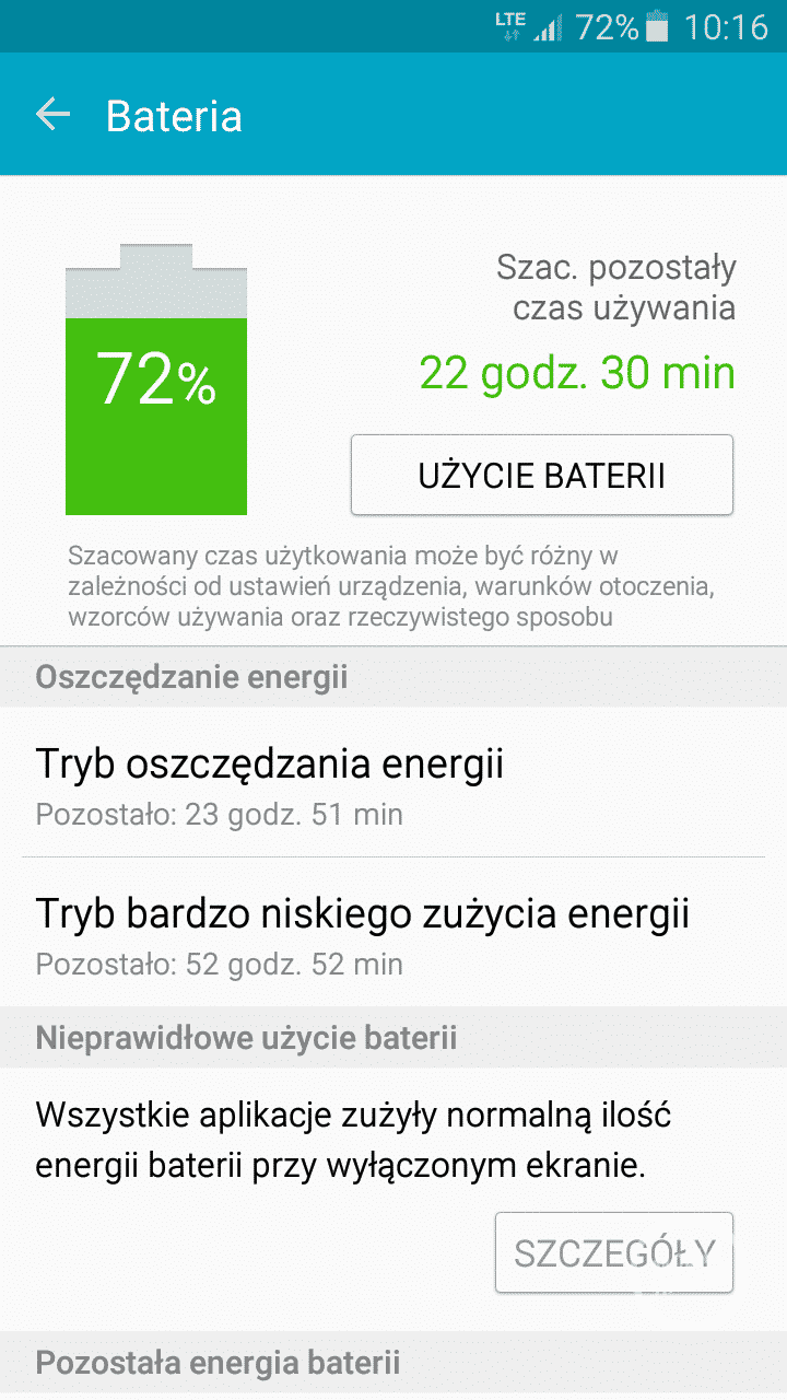 Bateria o pojemności 2600 mAh spokojnie wystarczy na cały dzień intensywnego użytkowania telefonu. Podczas testów zdarzało się, że na koniec dnia była naładowana w ponad 60-ciu procentach. Myślę, że przy oszczędnym użytkowaniu spokojnie wytrzymałaby dwa dni. Przy tej okazji warto też wspomnieć o trybach oszczędzania energii. Do wyboru mamy dwa: zwykły i tryb bardzo niskiego zużycia energii. Ten pierwszy wydłuży czas pracy urządzenia o około godzinę, natomiast drugi potrafi dać nam nawet dodatkowe 30 godzin. To ogromna ilość i na pewno docenią to osoby będące np. w podróży, kiedy dostęp do prądu będzie bardzo utrudniony. Oprogramowanie dostarczone przez producenta informuje nas też o tym, czy jakieś aplikacje nie zużywają zbyt dużo prądu. A to daje nam większą kontrolę nad stanem baterii.