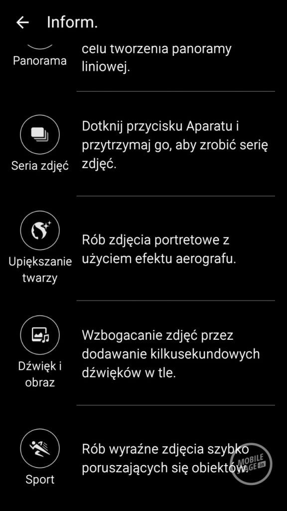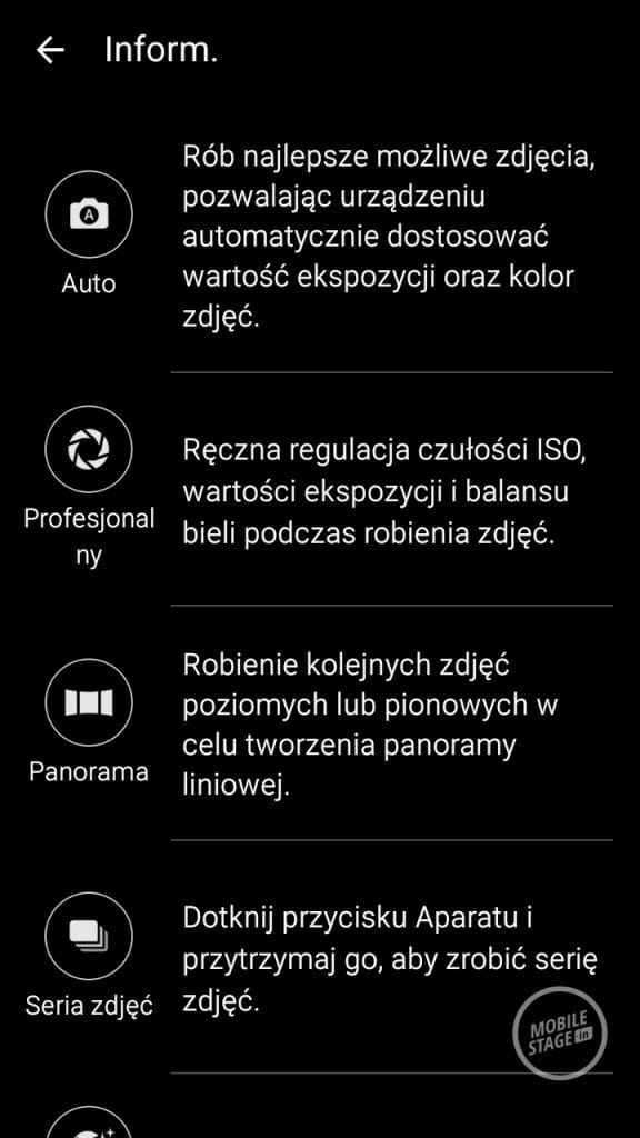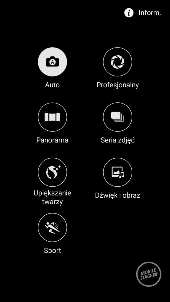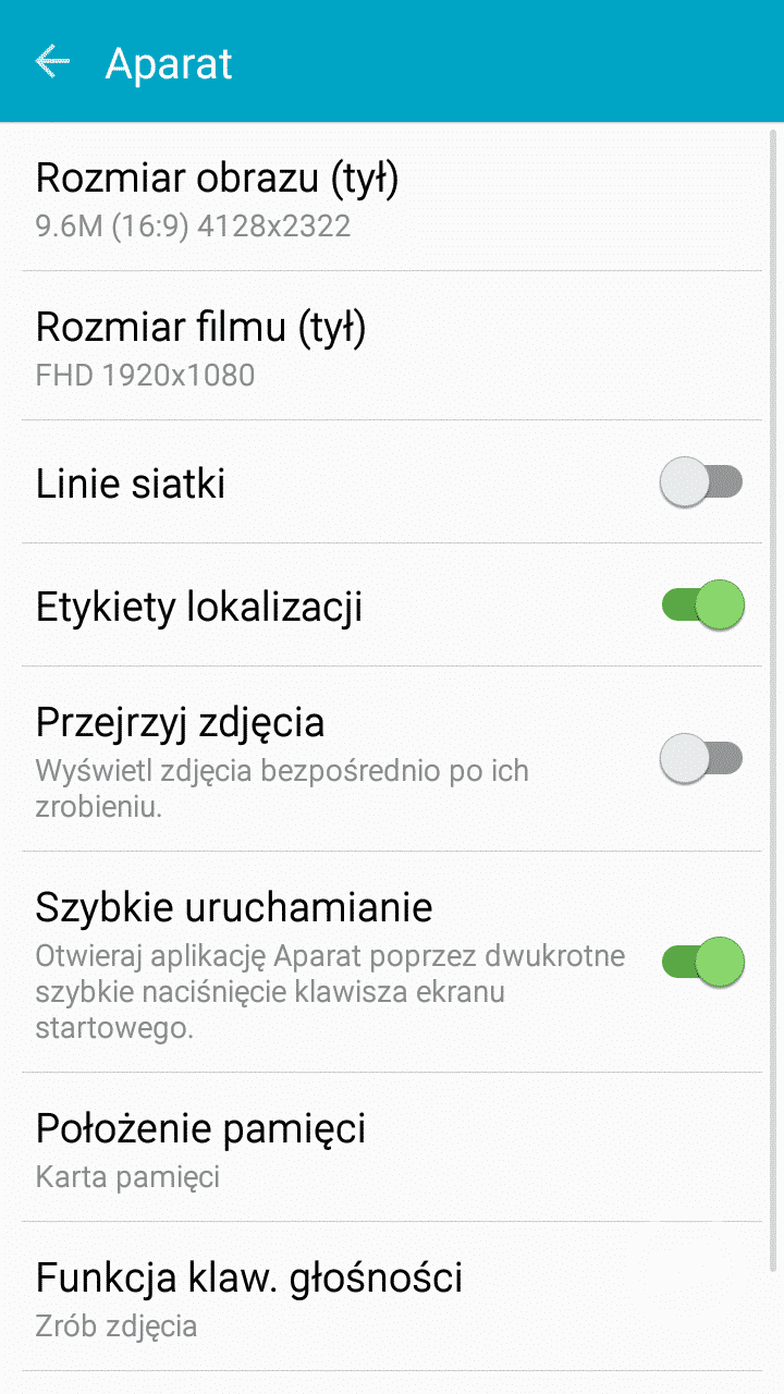 Sama aplikacja aparatu jest bardzo prosta i posiada tylko podstawowe funkcje. Dla przeciętnego użytkownika będzie wystarczająca. Oferuje ona takie opcje jak: włączenie/wyłączenie lampy błyskowej, opóźnienie migawki, zmianę wielkości zdjęcia, włączenie linii siatki, etykietę lokalizacji, miejsce zapisu zdjęć, a także funkcję szybkiego włączenia aparatu przez dwukrotne naciśnięcie klawisza ekranu startowego. Ta ostatnia idealnie się sprawdzi, kiedy szybko będziemy chcieli uchwycić jakiś moment. Aplikacja oferuje też kilka trybów: auto, profesjonalny(pozwala nam ustawić iso w zakresie 100 do 800 oraz balans bieli), panorama, seria zdjęć, upiększenie twarzy (rozmywa obraz przez co widać mniej niedoskonałości naszej twarzy), dźwięk i obraz (nagrywa dźwięk maksymalnie przez 9s po zrobieniu zdjęcia) oraz sport.