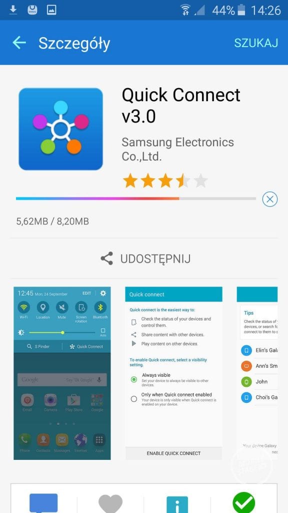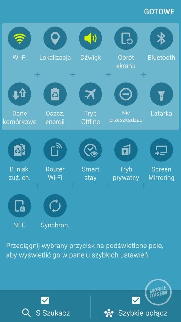 W niektórych miejscach Touchwiz UI promuje też inne rozwiązania Samsunga. Na belce powiadomień możemy uzyskać łatwy dostęp do S Szukacz i Szybkich Połączeń (błyskawiczne podłączenie różnych akcesoriów, np. słuchawek bezprzewodowych czy smartwatchy). Łatwo też uruchomimy moduł Smart Stay (wygaszenie ekranu kiedy na niego nie patrzymy) czy latarkę (która w końcu trafiła do szybkich ustawień).