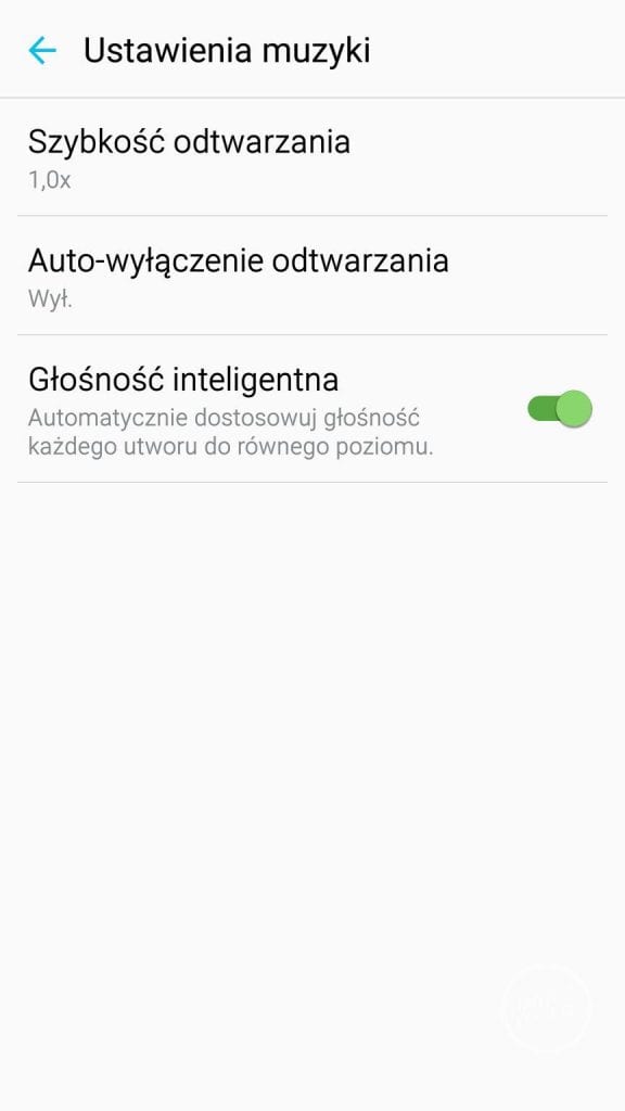 Wbudowana aplikacja muzyczna, choć została lekko okrojona w porównaniu do edycji znanej z Galaxy S5 i zyskała lekko zmodyfikowany układ to nadal jest funkcjonalna. Brakowało mi placu muzycznego, który polubiłem, mimo to bez niego da się żyć. Dość szybko możemy wybrać interesującego nas wykonawcę, album, listę odtwarzania lub utwór. Dodatkowo mamy dostęp do korektora dźwięku z predefiniowanymi ustawieniami (SoundAlive).