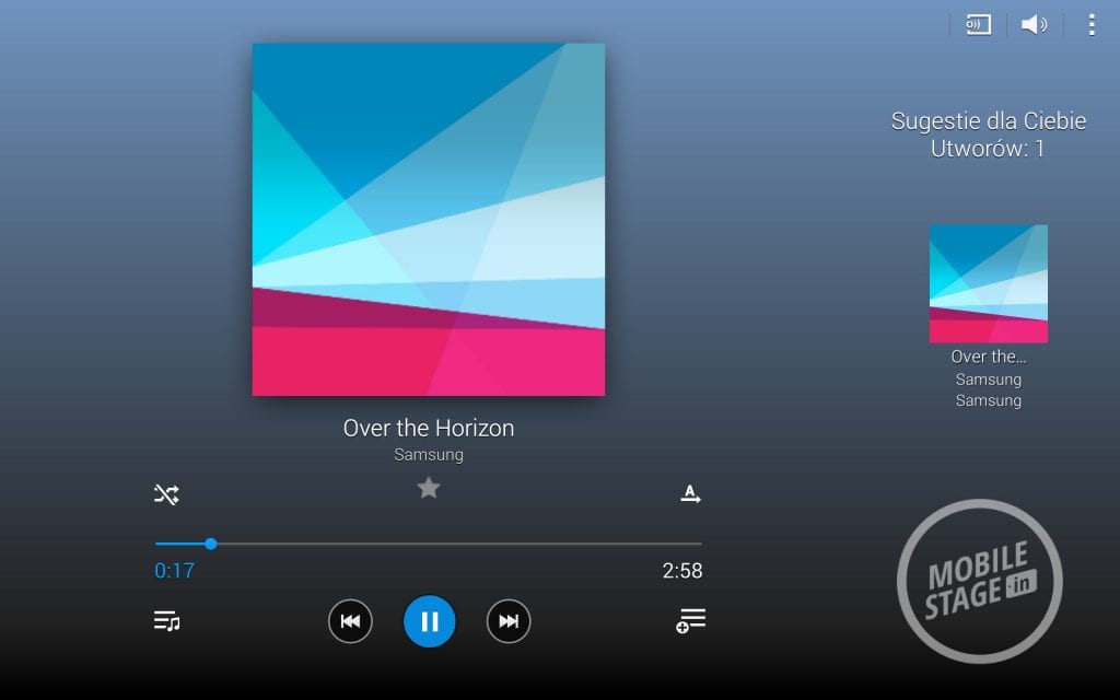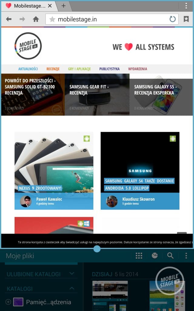 Multimedia to rzecz, dla której kupuje się urządzenie takie jak to. Nie łudźmy się, że na takiej przekątnej ekranu będzie nam się wygodnie pracowało nad dokumentami biurowymi, arkuszami kalkulacyjnymi itp. Jednak jako narzędzie do obsługi multimediów nadaje się świetnie. Bez problemu odtwarza najpopularniejsze formaty plików audio i wideo. Dobry, a nawet bardzo dobry dźwięk zawdzięczamy dwóm głośnikom. Miejsce ich ulokowania nie jest jednak zbyt trafne, gdyż trzymając urządzenie poziomo i w obydwu rękach, najczęściej będziemy zasłaniać obydwa. Sytuacja ta częsta jest zwłaszcza podczas grania w gry. Sporym plusem w kwestii multimediów jest umieszczenie portu podczerwieni w urządzeniu, służącemu dzięki odpowiedniej aplikacji jako pilot do telewizora. Nie miałem większego problemu ze sparowaniem urządzeń w moim domu z tabletem. Co prawda na co dzień wolałem korzystać ze zwykłego pilota jednak jako ciekawy dodatek działa świetnie. Do obsługi multimediów znajdziemy w urządzeniu kilka autorskich aplikacji Samsunga, a każda z nich jest przemyślana i bardzo funkcjonalna. Oprócz standardowych Galerii, Muzyki, Wideo mamy jeszcze wspomnianego WatchON’a do obsługi tv oraz aplikację, która bardzo przypadła mi do gustu, a mianowicie Moje Pliki.