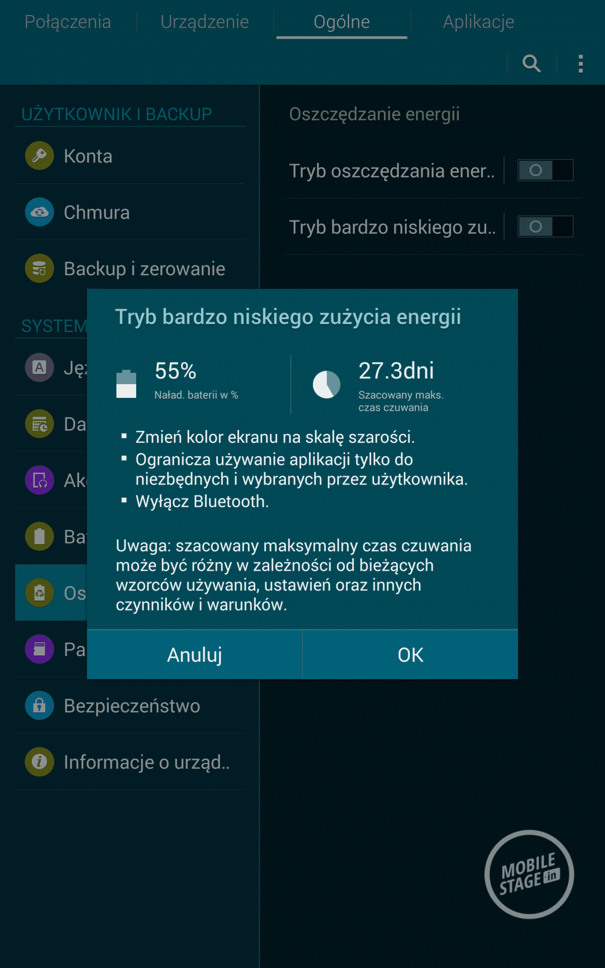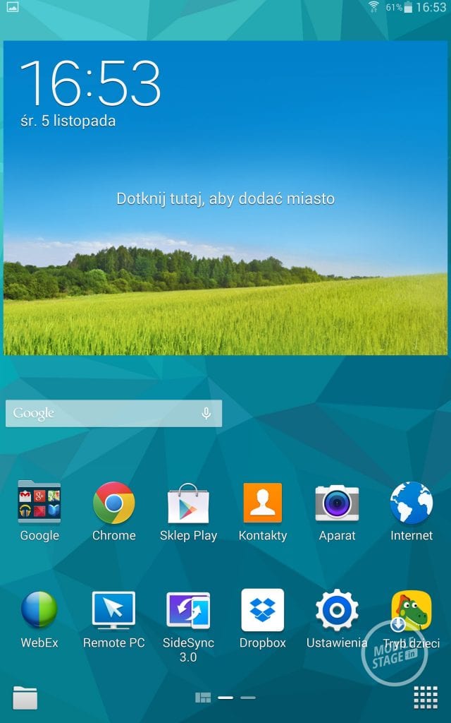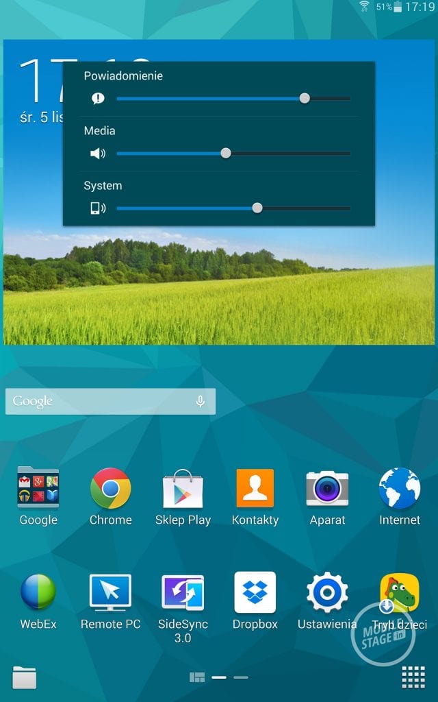 Tablet działa pod kontrolą Androida 4.4.2 Kitkat oraz posiada autorską nakładkę Samsunga, za którą osobiście nie przepadam. Pod względem wizualnym jest ona całkiem przyjemna, jednak jej zasobożerność sprawia, że całkowita przyjemność z korzystania z urządzenia lekko się ulatnia. Dużym plusem nakładki jest spora ilość ciekawych rozwiązań stosowanych tylko i wyłącznie w urządzeniach koreańskiego producenta. Znajdziemy tu miedzy innymi funkcje takie jak: wiele okien, przybornik, tryb prywatny, skaner odcisków palców, sterowanie gestami, Smart stay czy tryb bardzo niskiego zużycia energii. Jedyną nowością jest tryb czytania, a więc mamy tu lekko okrojony standard, który można było znaleźć w SGS5 z jednym tabletowym dodatkiem.