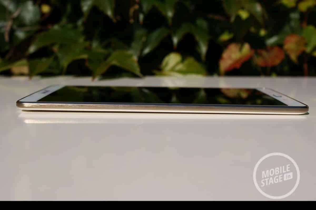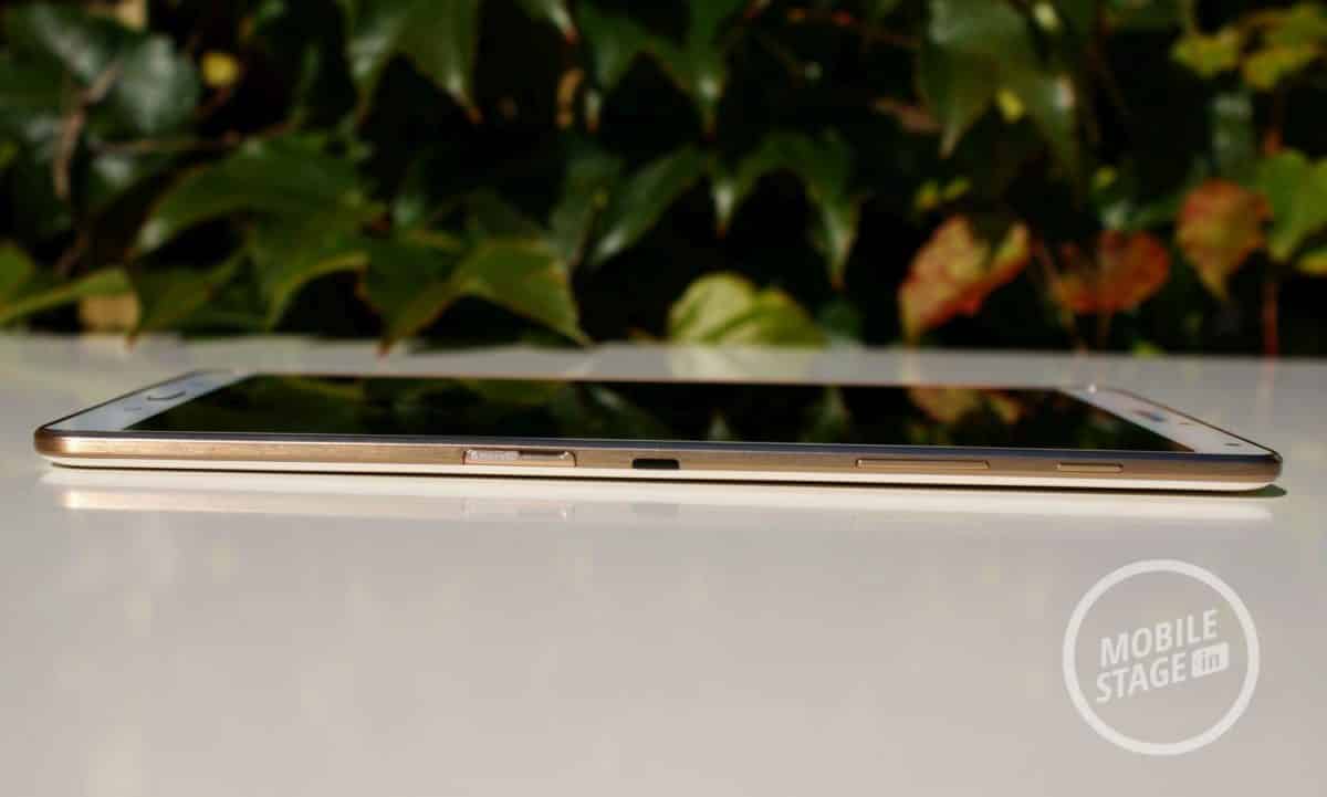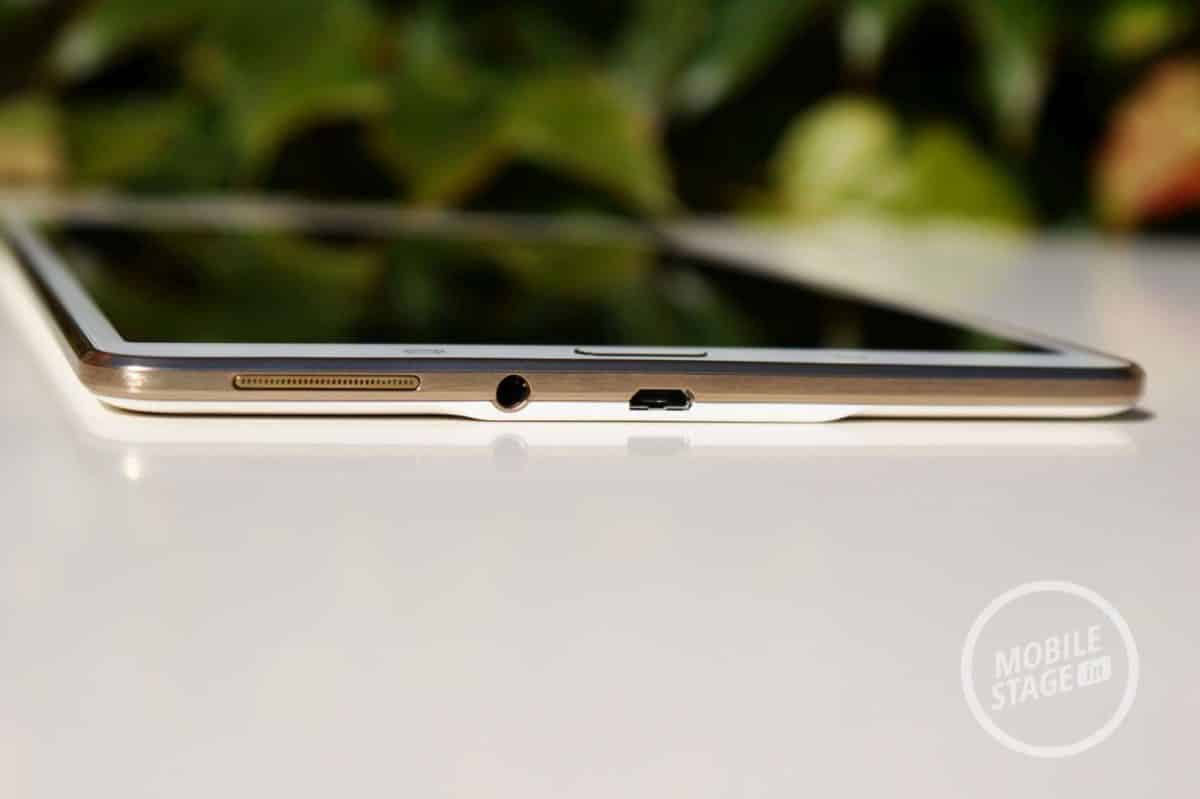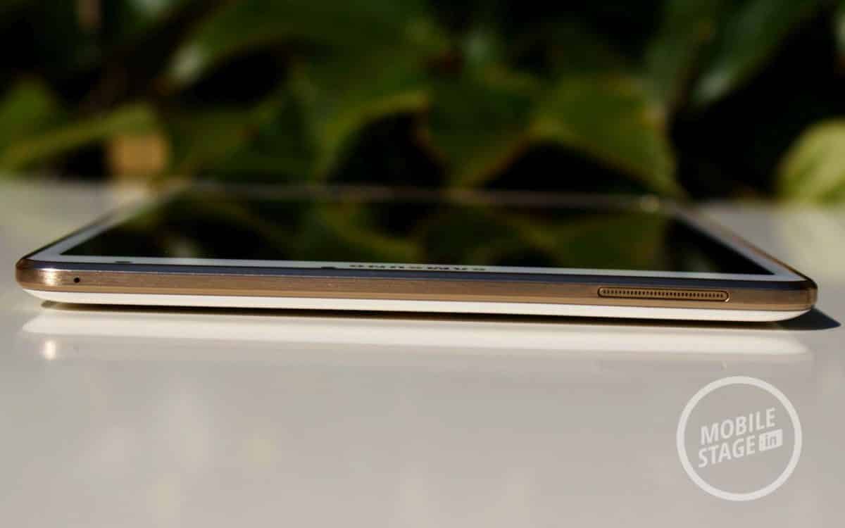 Jak widzimy na zdjęciach faktura tylnej klapki zbliżona jest do tej, którą zastosowano w najnowszym modelu telefonu z serii S. W przypadku s-piątki, dość mocno na to narzekałem, jednak być może to kwestia przyzwyczajenia, ale w tym tablecie, tłoczone kropki na tylnim panelu całkiem mi się podobają. Plastik nie jest tu gumowany, jednak nie ma to wpływu na wyślizgiwanie się urządzenia, gdyż ze względu na jego wielkość trzymamy go zwykle w sposób wykluczający tego typu kwestie. Wzdłuż bocznej krawędzi znajdziemy złotą ramkę, która zarówno w wariancie z białym jak i brązowym plastikiem prezentuje się całkiem nieźle. Urządzenie jest solidnie wykonane i nic nie ma prawa w nim trzeszczeć czy skrzypieć.