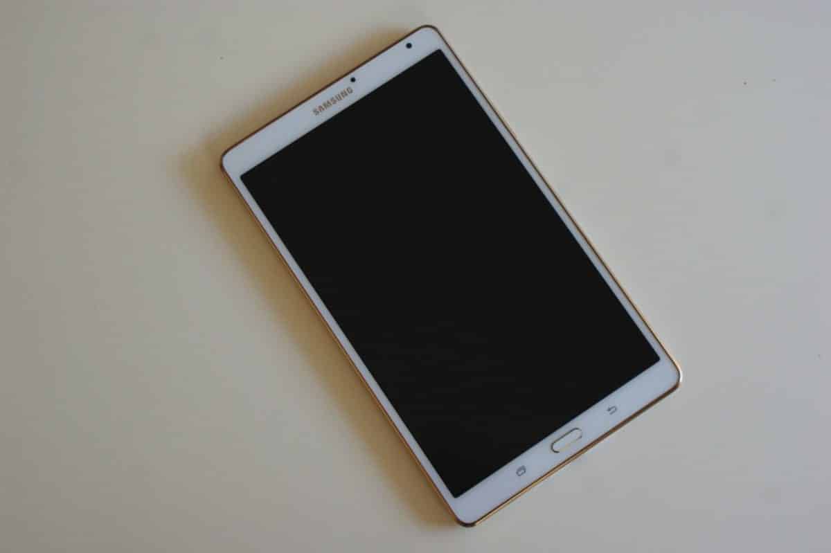 Nie przedłużając, skupmy się na wyglądzie i wykonaniu tabletu. Na przednim panelu pierwszym, co rzuca się w oczy jest oczywiście ekran o przekątnej 8,4”. Ponad nim mamy napis Samsung oraz czujniki i przedni aparat (w wersji z LTE znajdziemy tam również przedni głośnik). Natomiast pod nim standardowe przyciski stosowane w urządzeniach koreańskiego producenta. W przycisku HOME umieszczono czytnik linii papilarnych identyczny jak w telefonie Galaxy S5 (do recenzji którego zapraszam tutaj). Na dolnej krawędzi urządzenia znajdziemy jeden z głośników, gniazdo słuchawkowe oraz port microUSB. Lewa krawędź jest zupełnie pusta, nie znajdziemy tam żadnych przycisków. Od góry mamy drugi z głośników, natomiast po prawej stronie klawisz odblokowania, klawisze głośności, port podczerwieni oraz slot na karty microSD. Na tylnej stronie urządzenia znajdziemy aparat, diodę doświetlającą, napis Samsung oraz specjalne złącza magnetyczne do podpięcia dedykowanego pokrowca (tańszego chroniącego tylko ekran lub droższego chroniącego całe urządzenie i służącego jako podstawka).