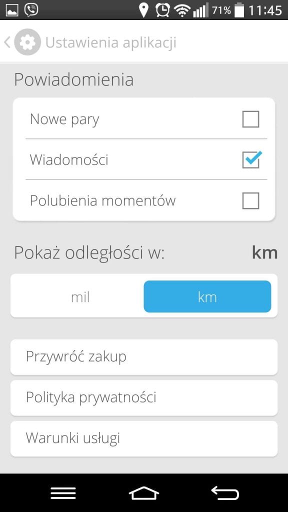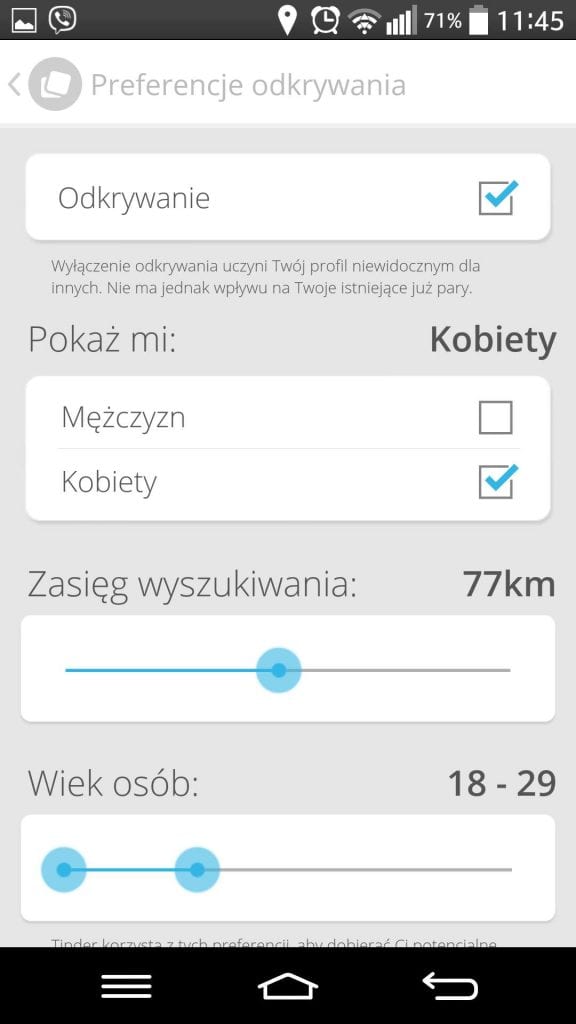 Nie wspomniałem o najważniejszej sprawie – bo wiadomo, internet to internet. Jak już poznamy kogoś niesamowitego to okazuje się, że mieszka na drugim końcu Polski. Dlatego Tinder korzysta z systemu GPS, dzięki niemu ustalamy maksymalną odległość w jakiej mogą znajdować się osoby, których profile będziemy widzieć. Dzięki czemu spotkanie się nie jest rzeczą trudną, a przynajmniej nie bardzo trudną. Słyszałem od znajomych, że poznali fajną dziewczynę, która mieszkała ulicę dalej, czy nawet w kolejnym bloku.