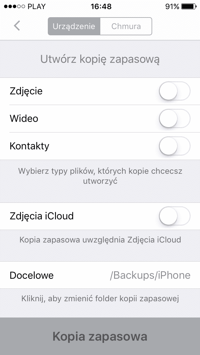 Godną uwagi opcją jest bez wątpienia możliwość wykonania kopii zapasowej danych znajdujących się w pamięci wewnętrznej urządzenia. Poza zdjęciami i nagraniami wideo nim wykonanymi, możemy także skopiować kontakty. Jest to bardzo wygodna funkcja, szczególnie jeśli potrzebujemy szybko oczyścić pamięć swojej „iZabawki”. Warto jednak zaznaczyć, iż wszystkie pliki są umieszczane w jednym folderze, bez jakiegokolwiek rozdzielenia na odpowiednie kategorie danych. Wydaje mi się, iż warto byłoby jednak rozważyć chociażby oddzielenie kontaktów od pozostałych materiałów.