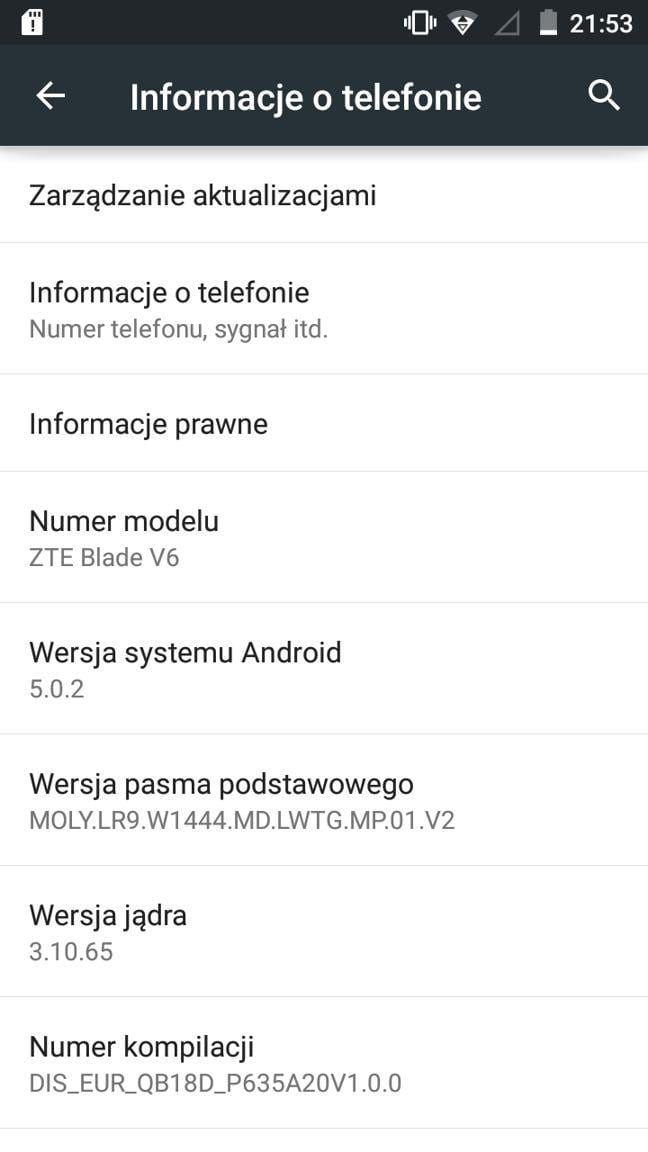 ZTE Blade V6 posiada 5-calowy ekran IPS LCD o rozdzielczości 720×1280 pikseli, co daje nam 294 ppi. Prezentowany przez wyświetlacz obraz można ocenić jako dobry z plusem. Odwzorowanie kolorów jest poprawne, czcionki wyraźne, a ekran precyzyjnie reaguje na dotyk. W przypadku zmiany kątów widzenia kolory są ciemniejsze i jest to mały minus, choć w trakcie codziennego użytkowania praktycznie nie do odnotowania. Dodatkowy plus można przyznać oferowanej jasności ekranu, która pozwala na pracę w słoneczne dni (choć praca w pełnym słońcu jest jednak ograniczona). Nie mam zastrzeżeń do kontrastu. Brak ekranu Full HD w przypadku tego urządzenia wpływa pozytywnie na jego szybsze działanie i mniejsze zapotrzebowanie na energię.