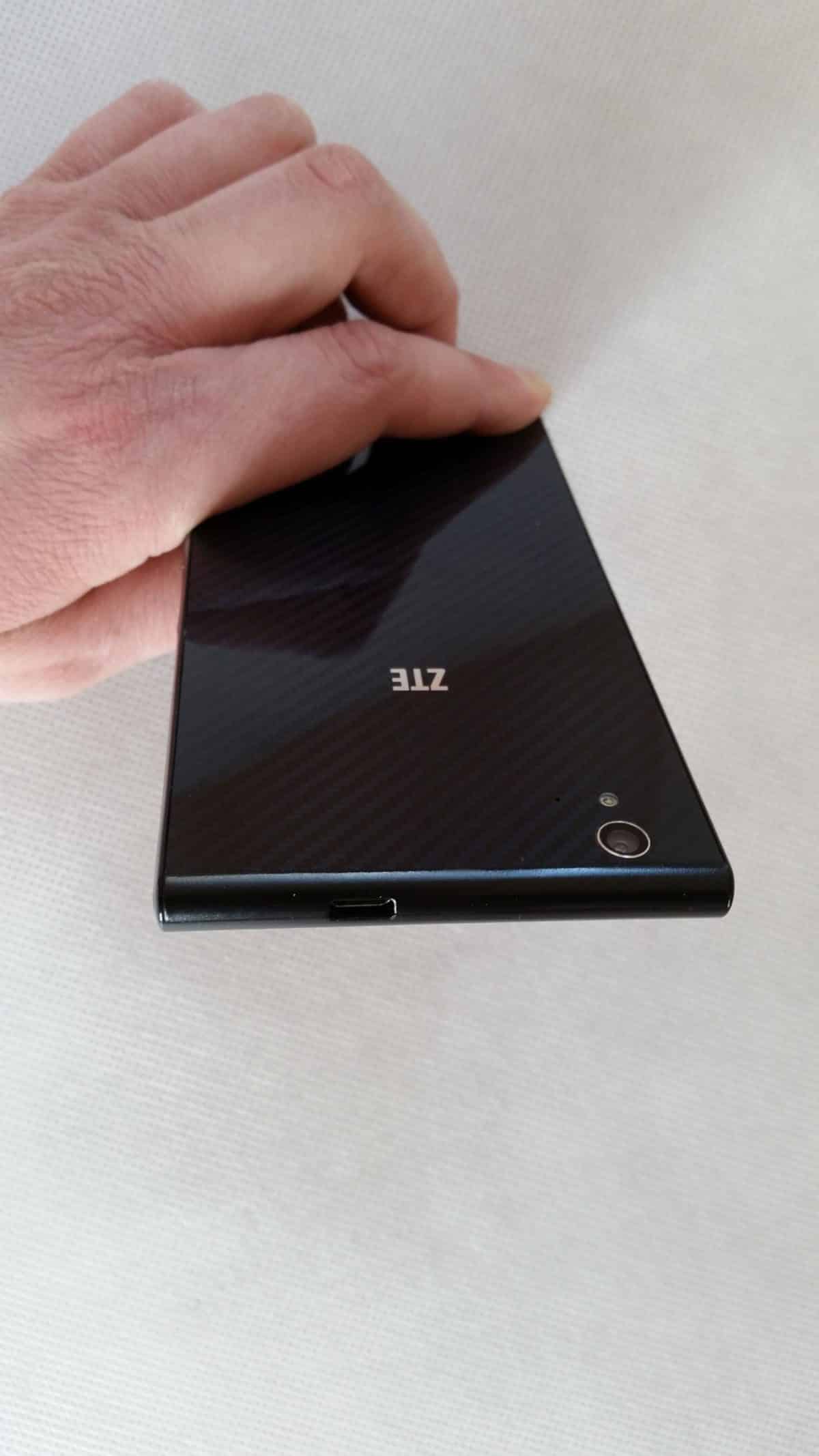 ZTE Blade VEC 4G ma konstrukcję monobloku. Niestety nie wymienimy w nim baterii, co może być istotną wadą dla wielu użytkowników. Ja niestety powoli przyzwyczajam się do tego standardu (choć nie do końca się zgadzam z tym trendem). Być może się w swoich osądach mylę, skoro większość producentów z uporem ogranicza tę możliwość na rzecz lepszego spasowania elementów, wodoodporności czy przyjemniejszego designu. W tym przypadku powodem jest wykorzystanie tafli szkła na tylnej części urządzenia. Panel ten posiada przyjemną teksturę, składającą się z prostokątów ustawionych na skos, tworzących swego rodzaju mozaikę. Daje to przyjemny efekt w połączeniu z ciemną tonacją (myślę, że w połączeniu z białym kolorem również taki deseń wyglądałby ładnie). Niestety zastosowane szkło zbiera ślady palców z niezwykłym zaangażowaniem, co wygląda dość nieprzyjemnie po dłuższym czasie użytkowania. Wystarczy jednak nakleić na tylny panel folię ochronną, albo regularnie go czyścić by być zadowolonym z efektu. W tej części urządzenia znajdziemy również obiektyw aparatu, niewielką diodę doświetlającą LED oraz logotyp producenta (mamy do czynienia jeszcze ze starszą wersją, która niedawno została zastąpioną nową identyfikacją koncernu).