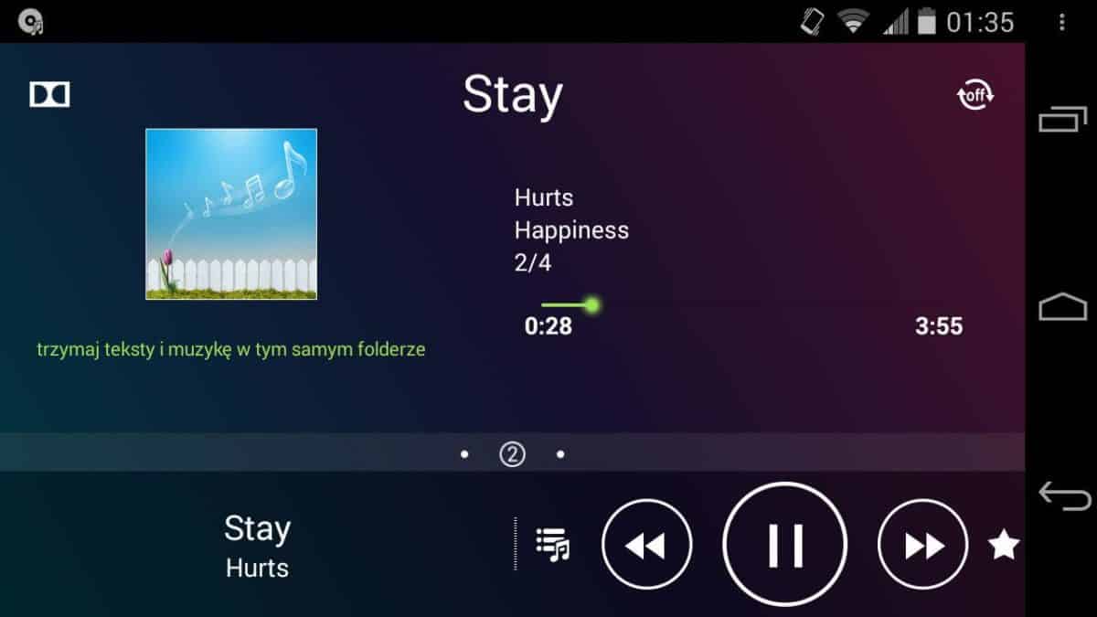 Wracając do samego odtwarzacza. Pozwala on nam wyświetlać utwory za pomocą wyświetlania wszystkich piosenek, playlist, folderów, albumów, wykonawców i gatunków. Dodatkowo wyświetla listę ulubionych utworów i ostatnio odtwarzanych. Do naszej dyspozycji oddano również opcję wyłączenie odtwarzacza po określonym czasie oraz możliwość wybrania tła odtwarzacza. Sama aplikacja jest połączona z programem Dolby. Opcji zatem nie ma zbyt wiele, ale zawsze możemy skorzystać z zewnętrznego oprogramowania, które pozwoli nam stworzyć mini kombajn multimedialny.